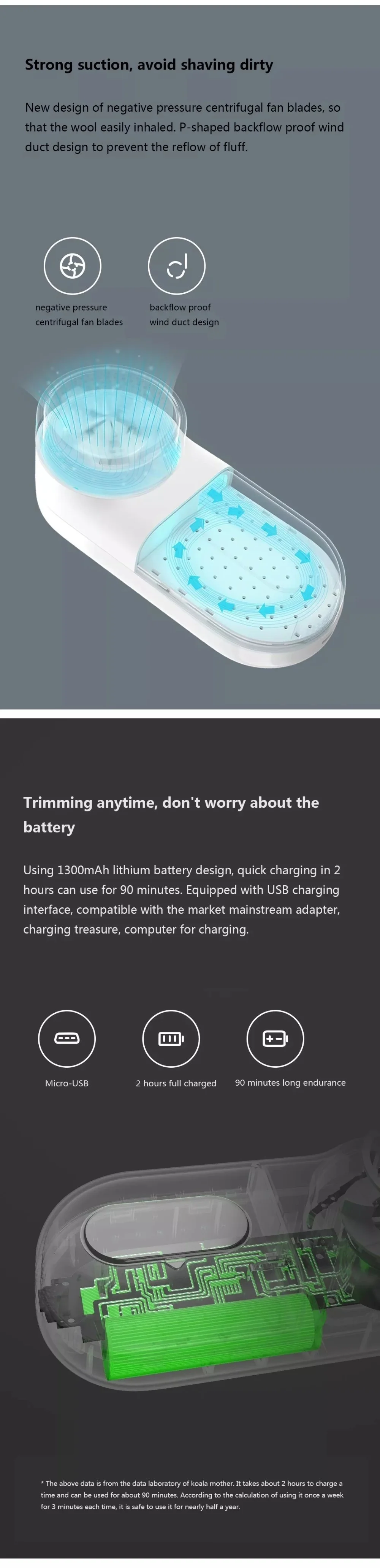 0,35 мм утолщенная микро-дуговая стальная сетка Разумно оптимизированный Сетчатый Дизайн, избегайте деформации нажатия, подходит для одежды без повреждений. 5 лопастей плавающая головка циклона Точное шлифование, улучшение эффекта сдвига, высокая эффективность сдвига. Сильное всасывание, избегайте грязного бритья Центробежные лопасти вентилятора отрицательного давления, так что шерсть легко вдыхается. P-образная защита от обратного потока конструкция ветрового воздуховода для предотвращения оплавления пуха. 1300 мАч дизайн литиевой батареи Быстрая зарядка в течение 2 часов может использоваться в течение 90 минут. Оснащен интерфейсом USB для зарядки, совместим с основным адаптером рынка, зарядным сокровищем, компьютером для зарядки. Двойная защита, безопасная и удобная Демонтируйте крышку головки триммера или откройте мусорное ведро, машина немедленно отключится, перестанет работать, чтобы избежать случайных травм. Скрытый световой светильник Электрическая индикаторная лампа принимает скрытый дизайн, указывающий работу машины и состояние электрического количества, простой и красивый. Fuzz bin Видимый дизайн окна Легко проверить, нужно ли очищать задник в ящике, уменьшить повторное отверстие для проверки. Чистящая Щетка Маленькая щетка для очистки использует дизайн с длинной ручкой, очистите небольшое положение, например, обрезную головку, мусорное ведро fuzz более удобным. Посылка включает в себя: 1x Mijia Fuzz триммер 1 кабель для зарядки Micro-USB 1x Чистящая Щетка 1 Инструкция