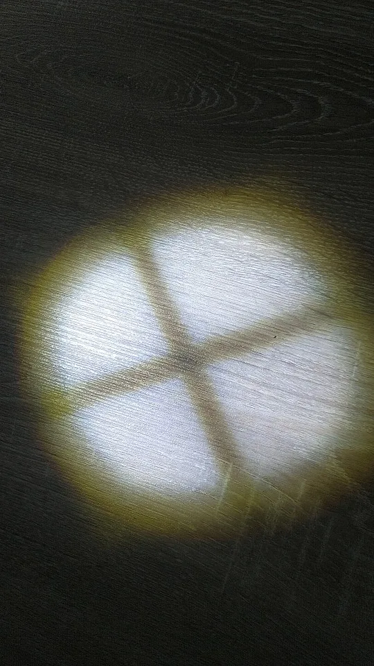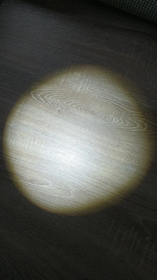 реально мощный свет, хорошая линза. максимально равномерное рассеивание при широком угле и очень точная фокусировка при узком. Но ореол небольшой остается. При узком угле видны 4 световых пятна от 4 светодиодов (на фото).