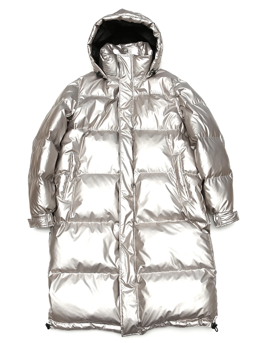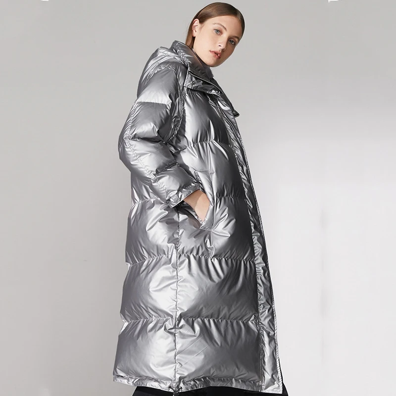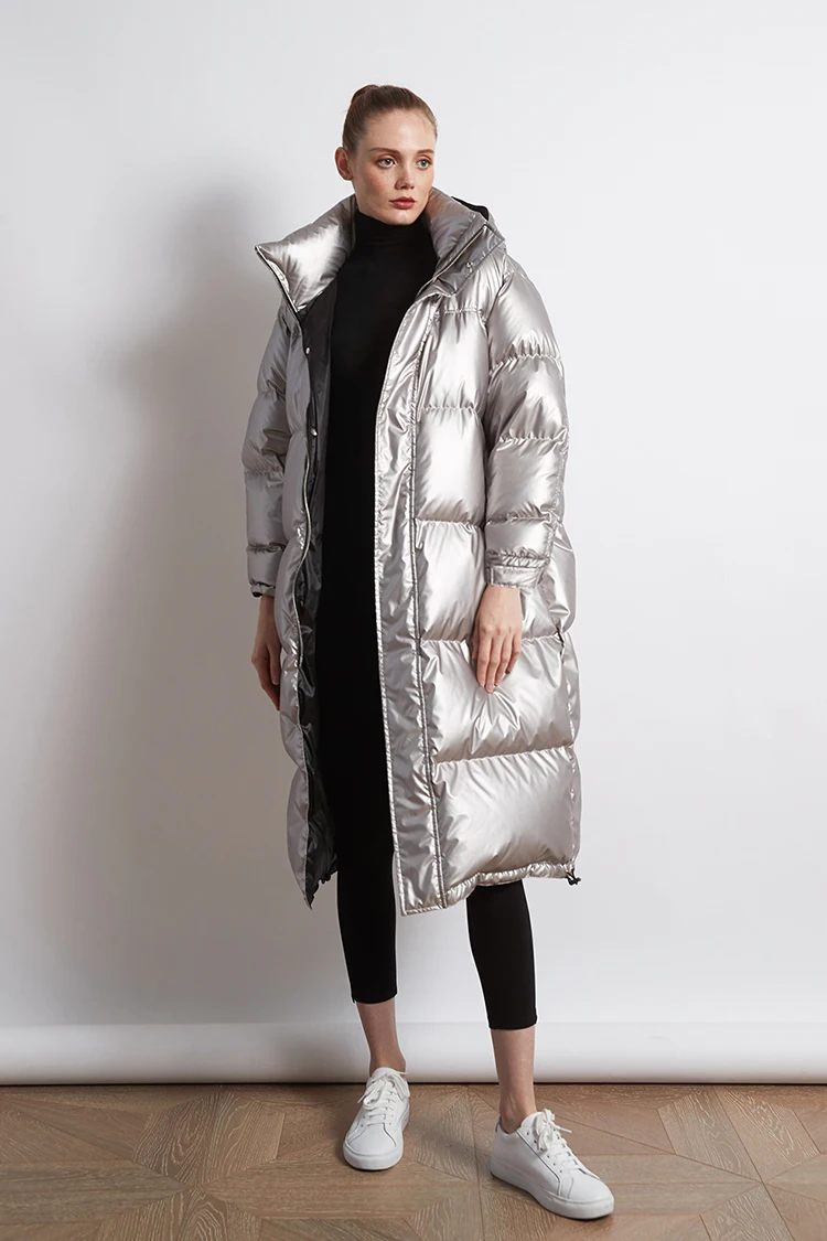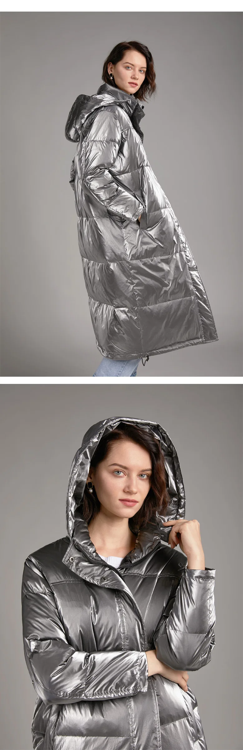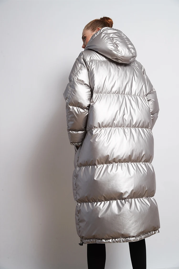 Парка женская зимняя на утином пуху, блестящая, серебристая, с капюшоном