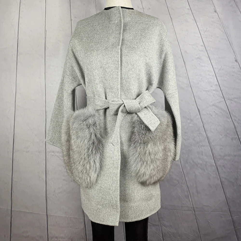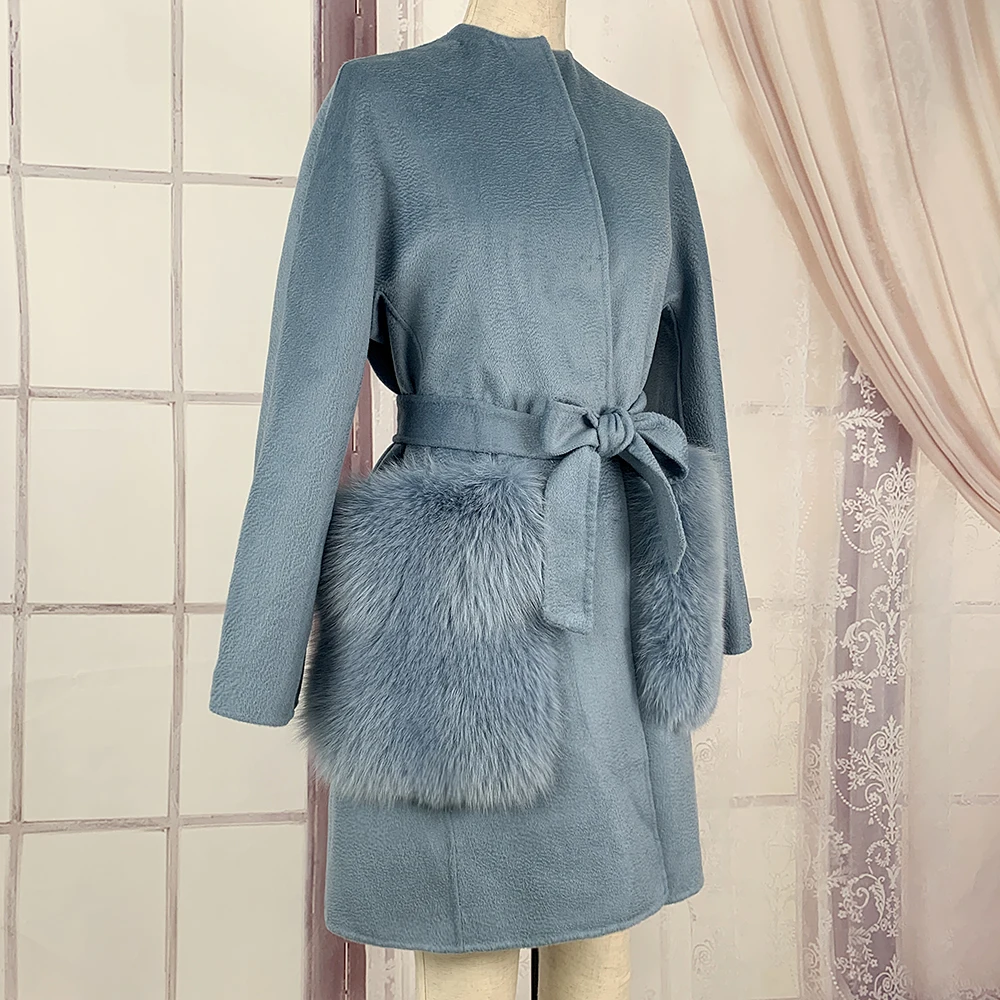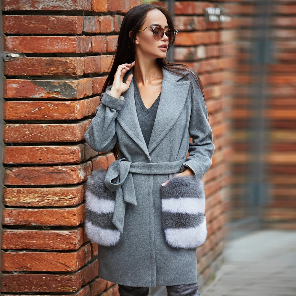 2020 Новое модное Полушерстяное пальто с натуральным лисьим мехом большой карман воротник высокого качества из натуральной кожи; Женские зимние пальто NZ-070