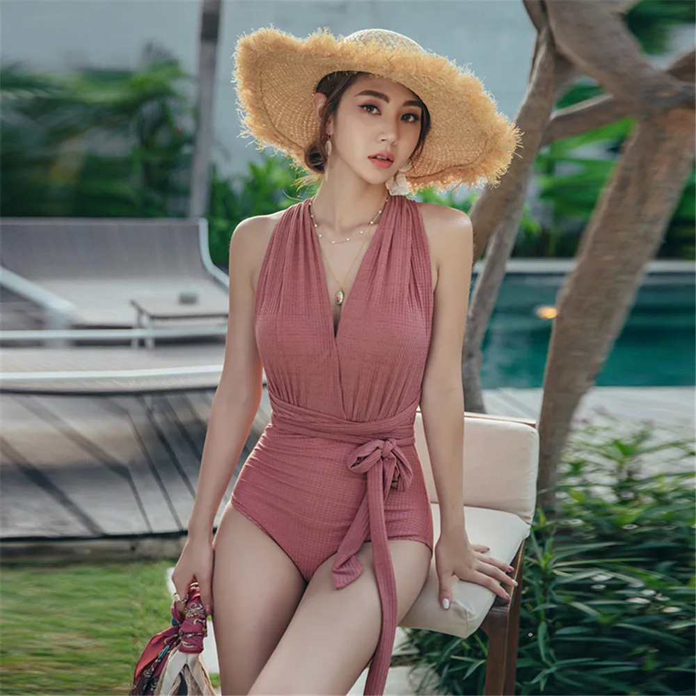 Корейский цельный купальный костюм для женщин, однотонная одежда для плавания, сексуальный Монокини с высоким вырезом, пуш-ап, купальный костюм с поясом, трикини, два предмета, купальный костюм красного цвета