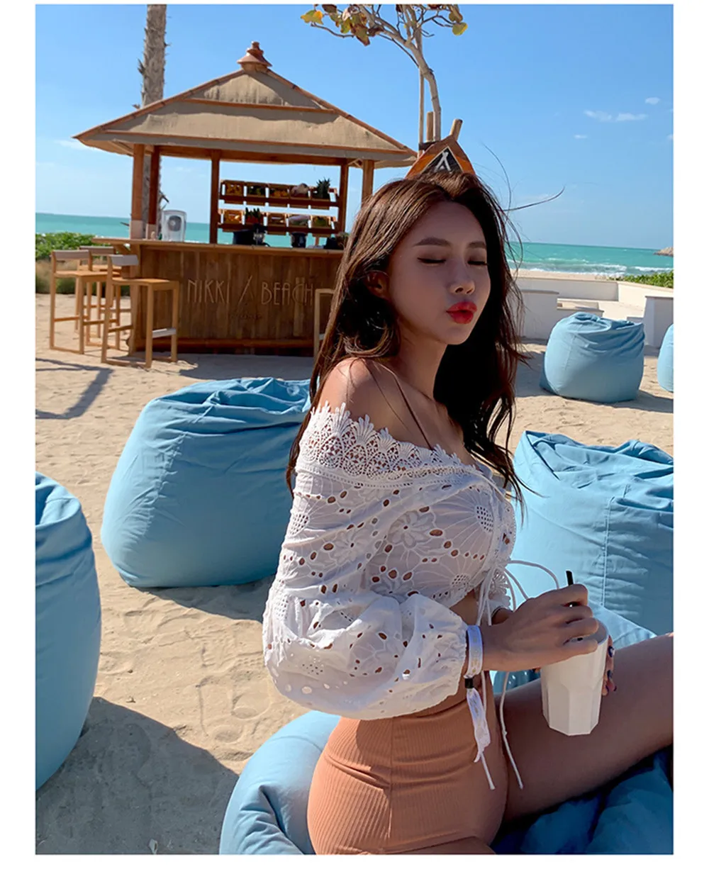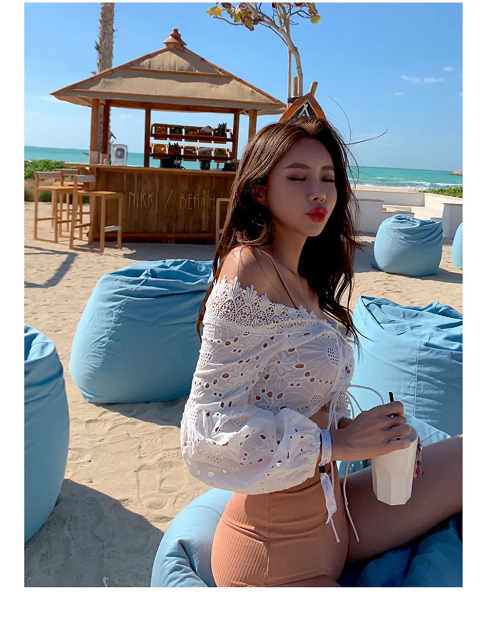 Женский однотонный купальник бикини с высокой талией, кружевной пикантный купальник с открытыми плечами, накидка для бикини, комплект для плавания в Корейском стиле, 3 комплекта