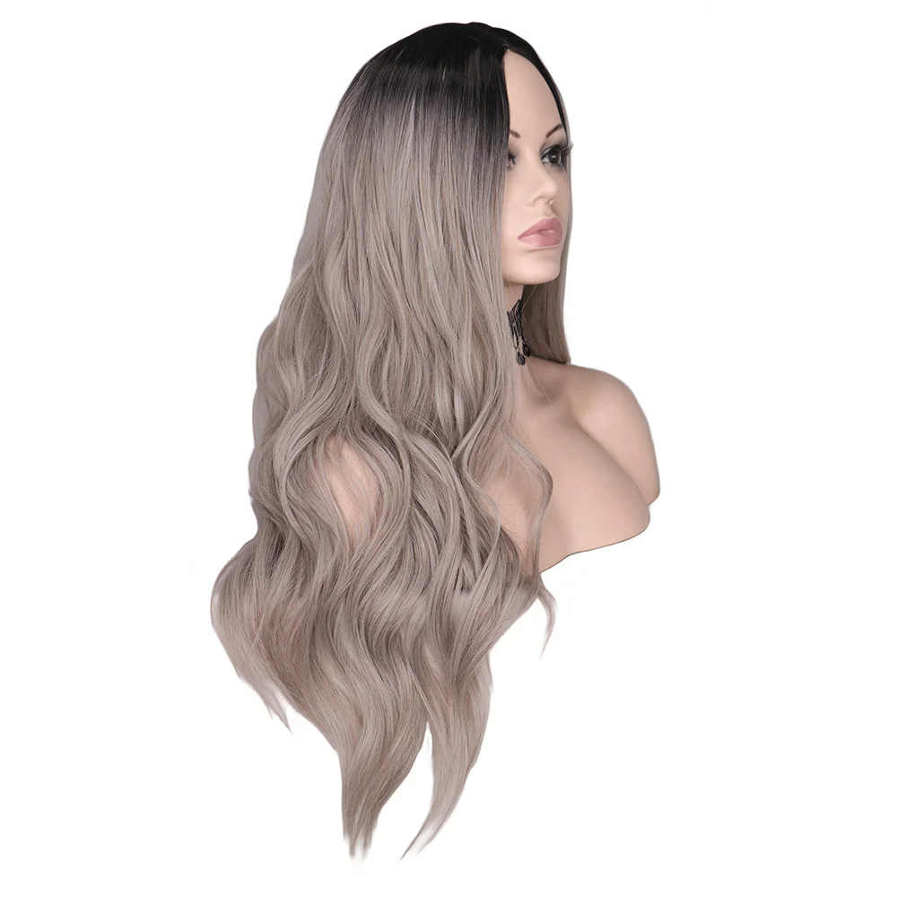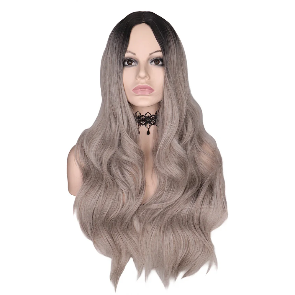 Парик женский волнистый с эффектом омбре, с длинными волнистыми черными, серыми смешанными светлыми волосами, с естественной средней частью, термостойкий, синтетический
