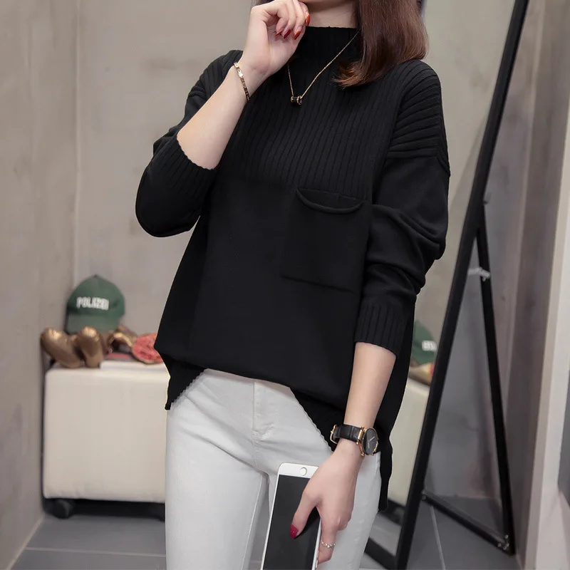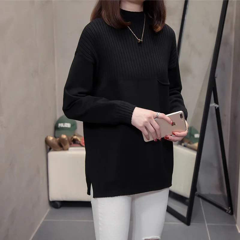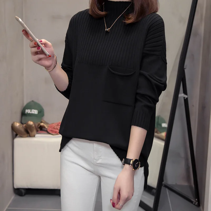 Модные новые осенние женские водолазки в корейском стиле 2021 года, пуловеры с длинным рукавом, свитера с карманом, свободные женские вязаные топы