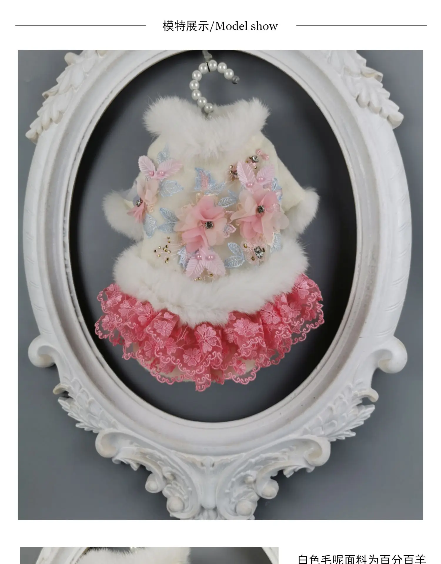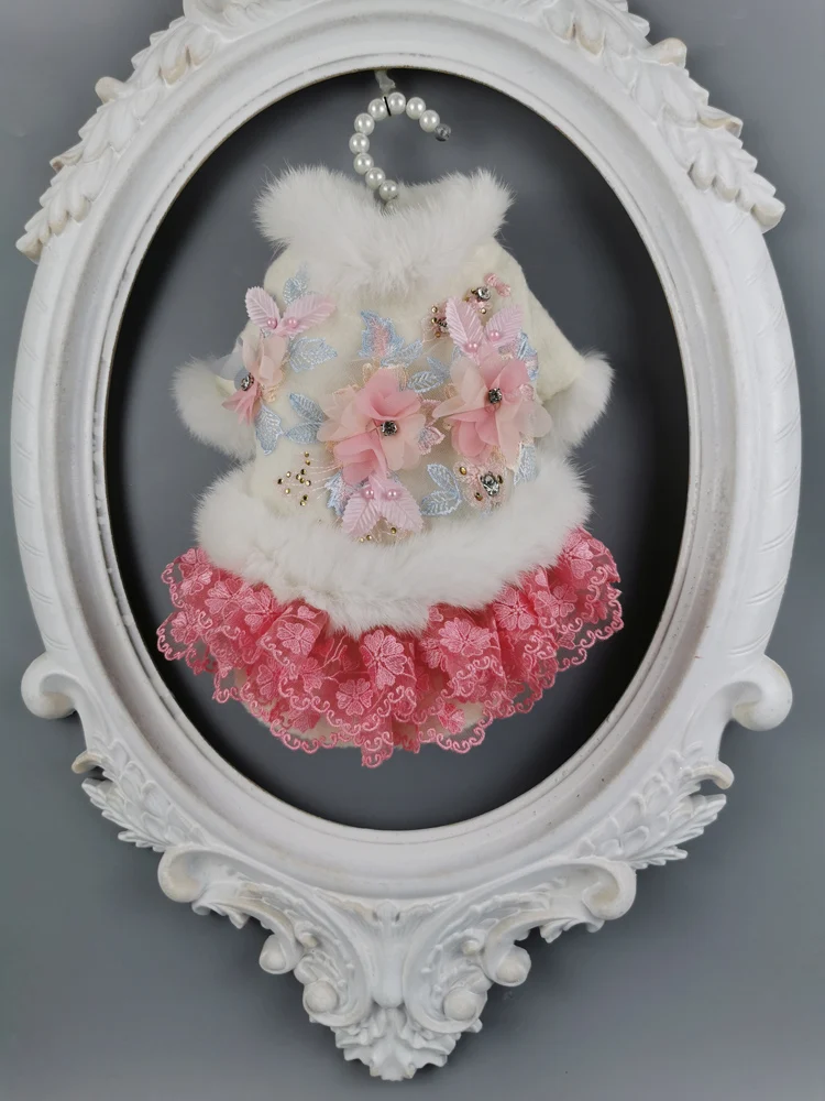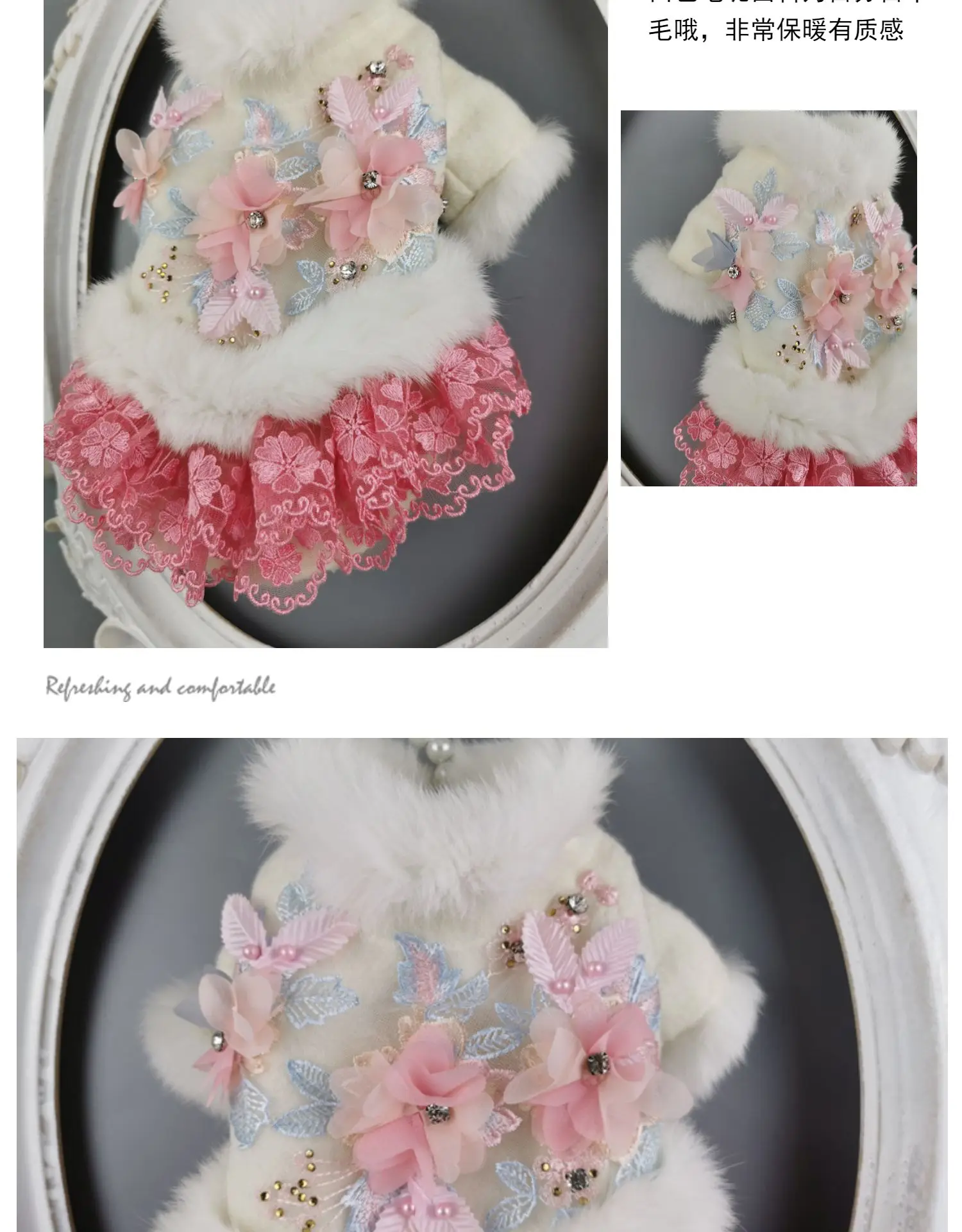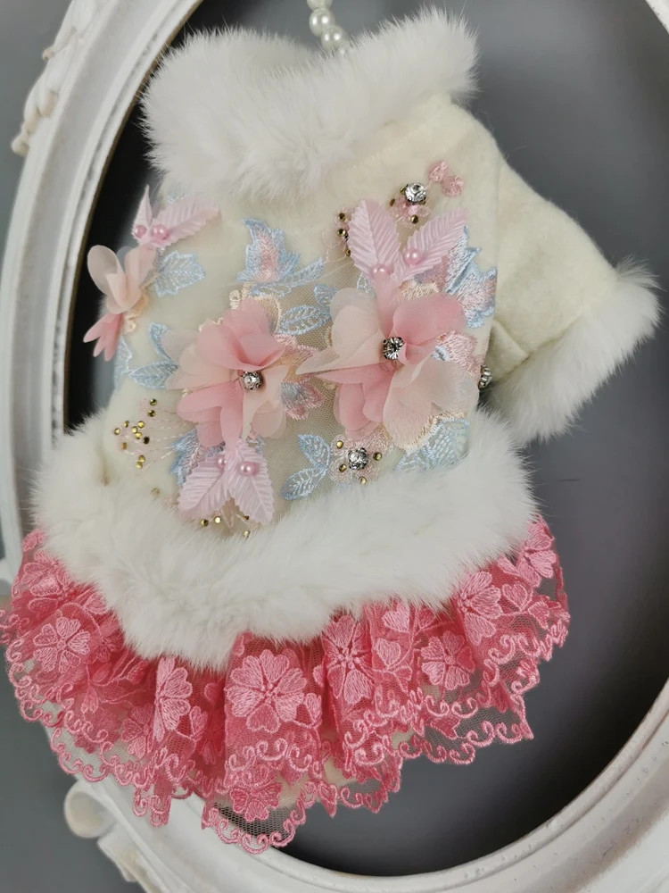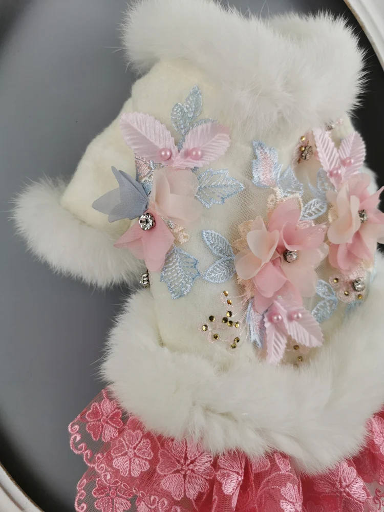 Бесплатная доставка, одежда для собак ручной работы, шерстяное пальто для домашних животных, платье, воротник из искусственного кроличьего меха, Кристальные цветы, наряд для кошки, праздничный для Йорка