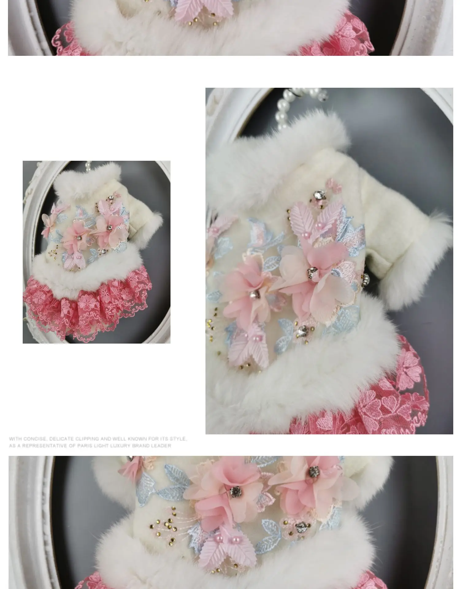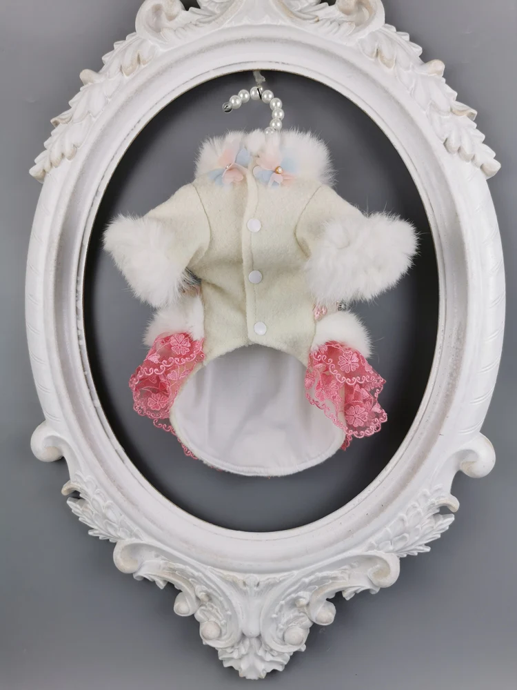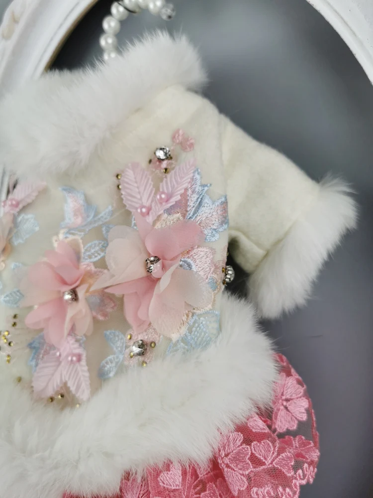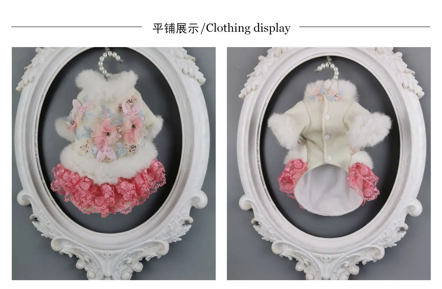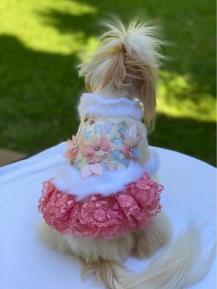 Бесплатная доставка, одежда для собак ручной работы, шерстяное пальто для домашних животных, платье, воротник из искусственного кроличьего меха, Кристальные цветы, наряд для кошки, праздничный для Йорка