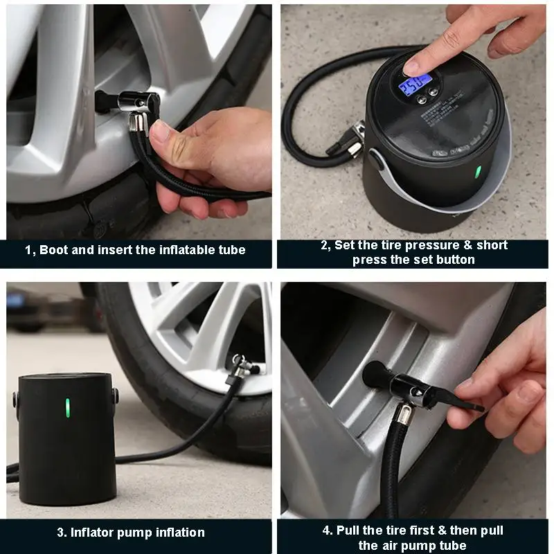 1. Благодаря встроенному аккумулятору наш беспроводной компрессорный насос дает вам свободу брать воздушный компрессор с собой куда угодно, не беспокоясь о поиске внешнего источника питания. Он также поддерживает зарядку дома и автомобиля.