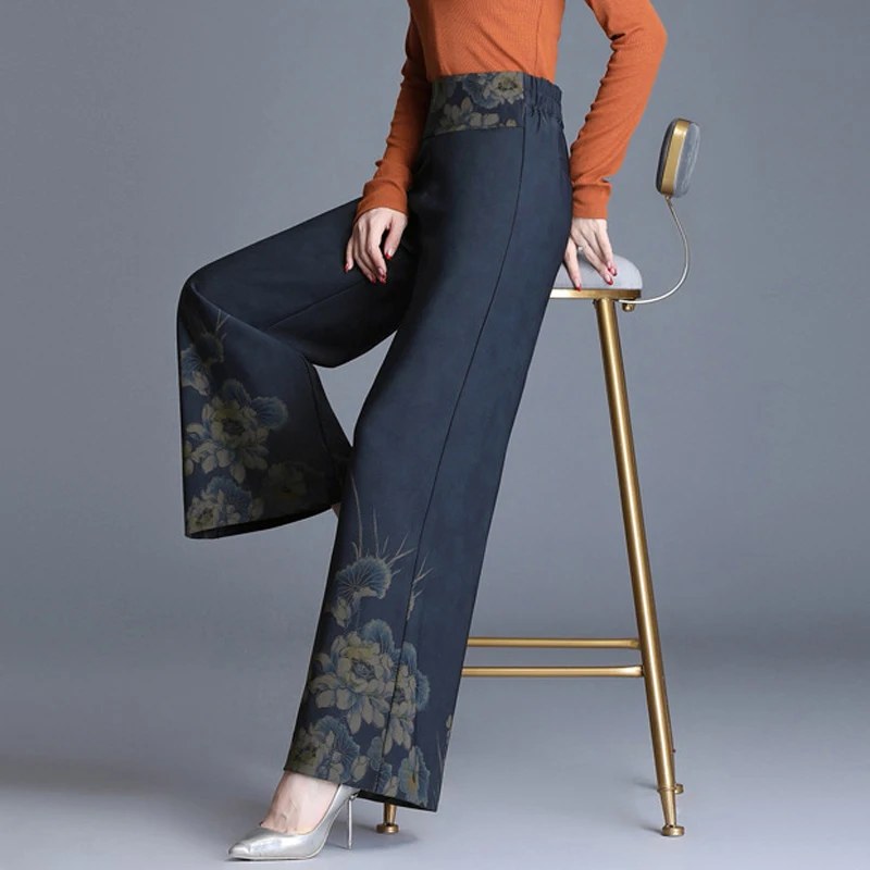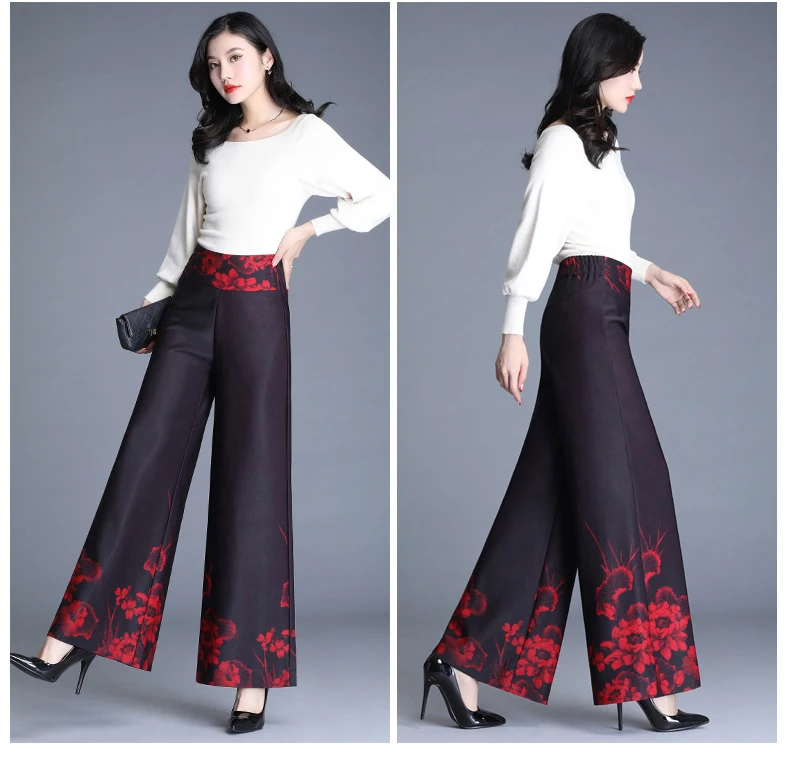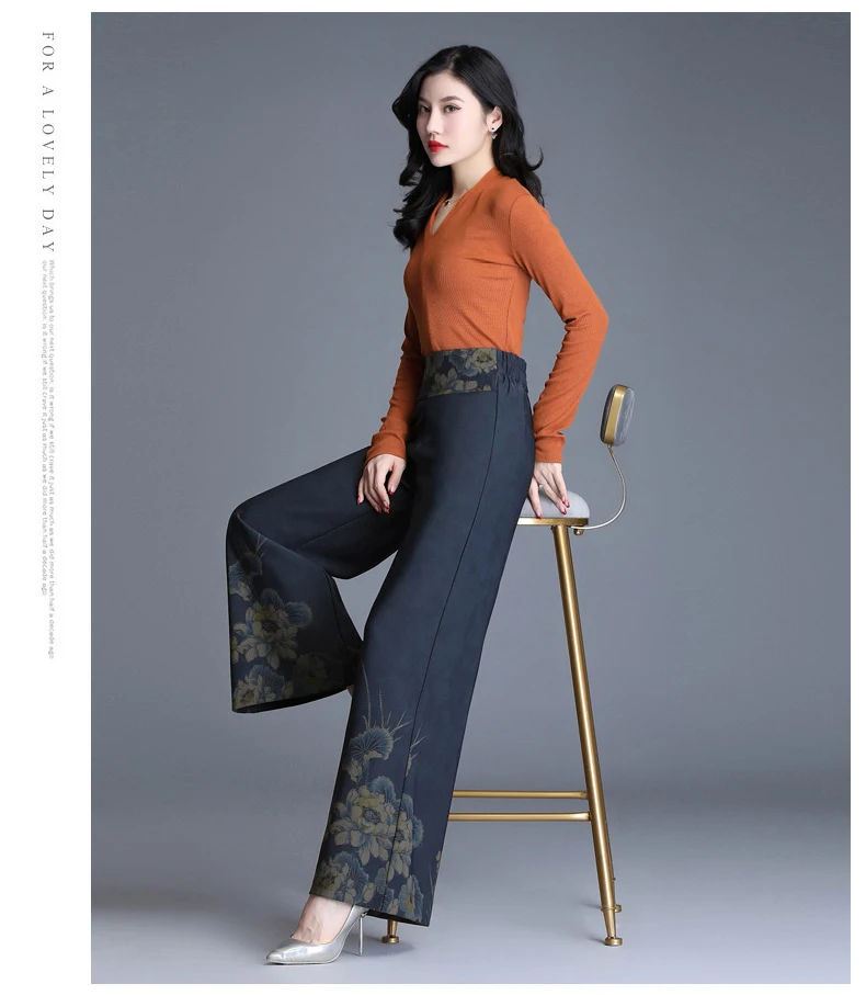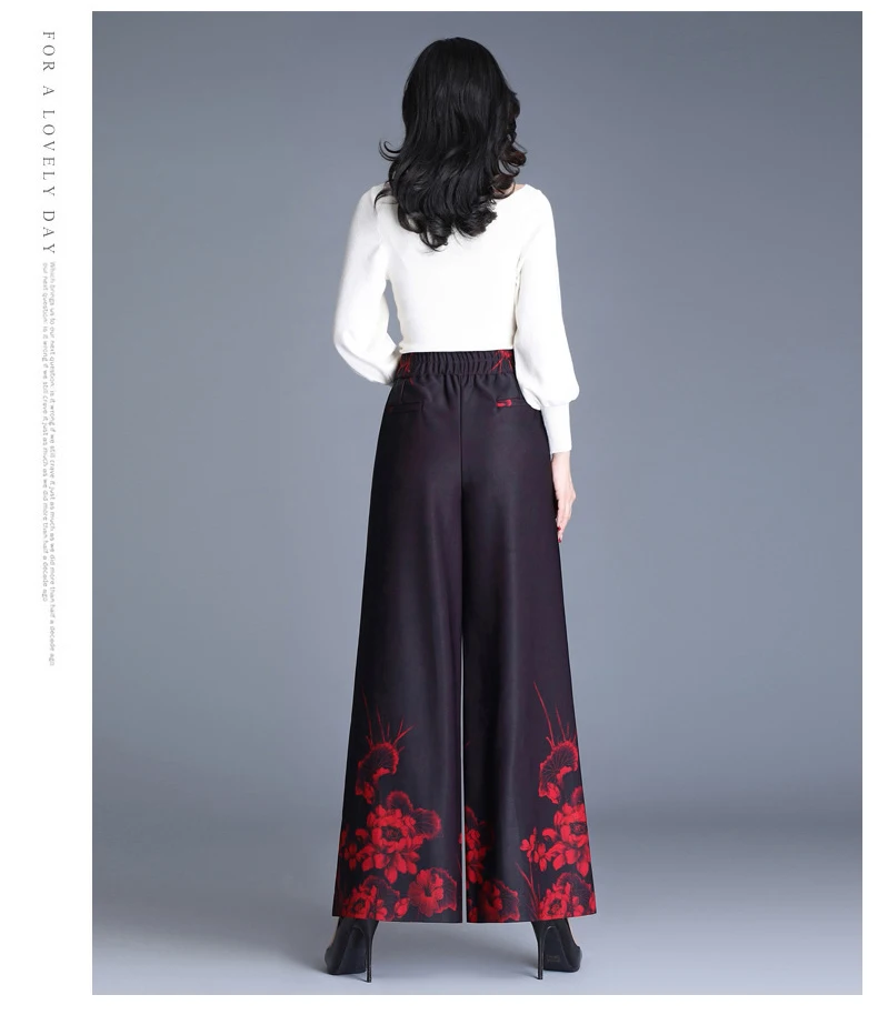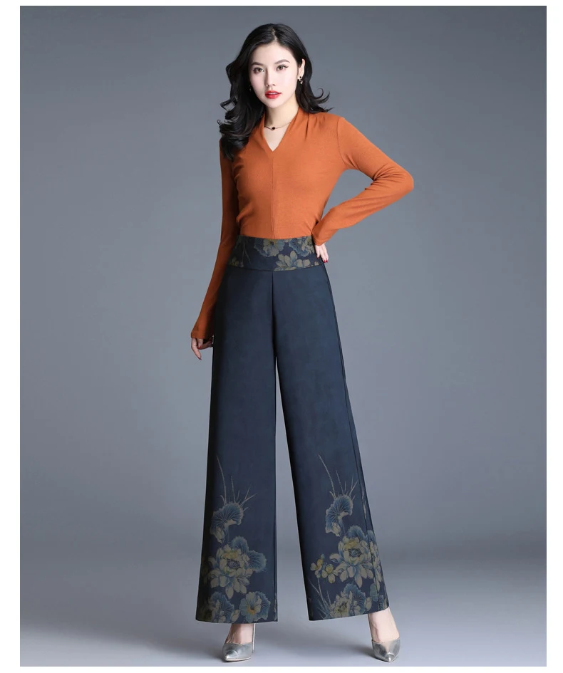 Брюки женские с широкими штанинами, жаккардовые свободные прямые утепленные штаны с высокой талией, с цветочным принтом, большие размеры, на осень-зиму