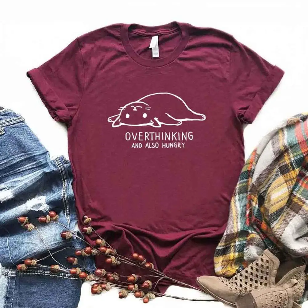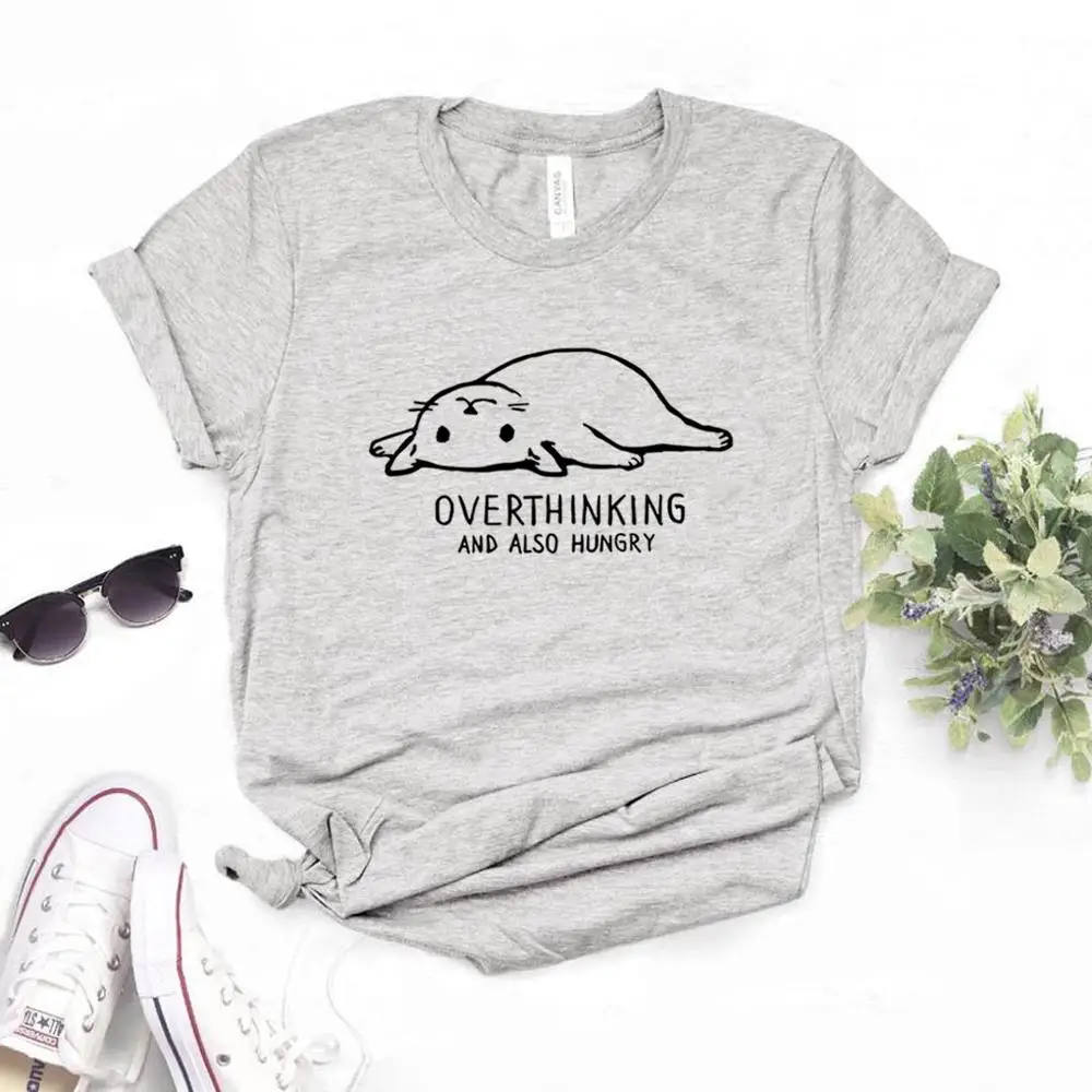 Overthinking, а также голодных кошка мама принт для женщин футболки хлопок повседневное забавная Футболка для леди Yong топ для девочек, футболка, NA-981