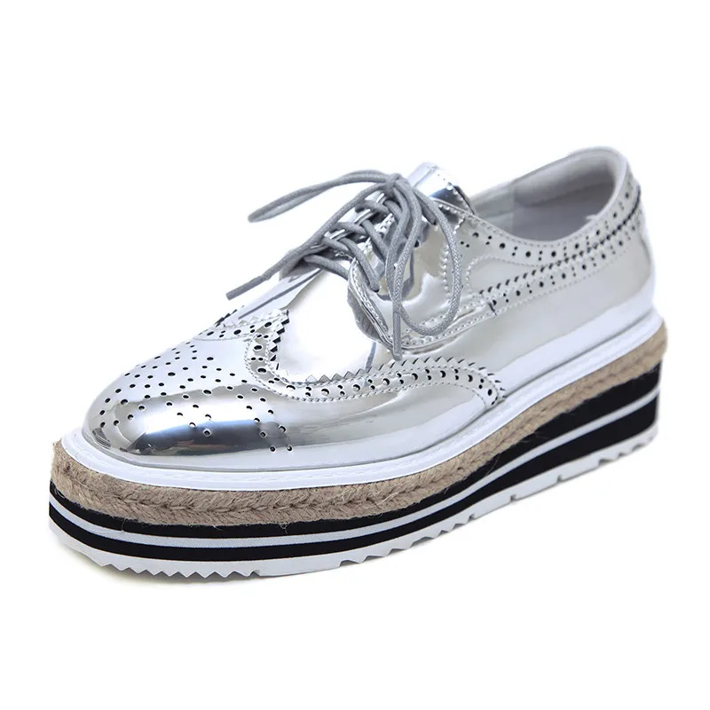 Туфли-оксфорды женские из лакированной кожи, на платформе, броги, плоская подошва, на шнуровке, квадратный носок, Брендовая обувь для женщин, криперы, серебристые