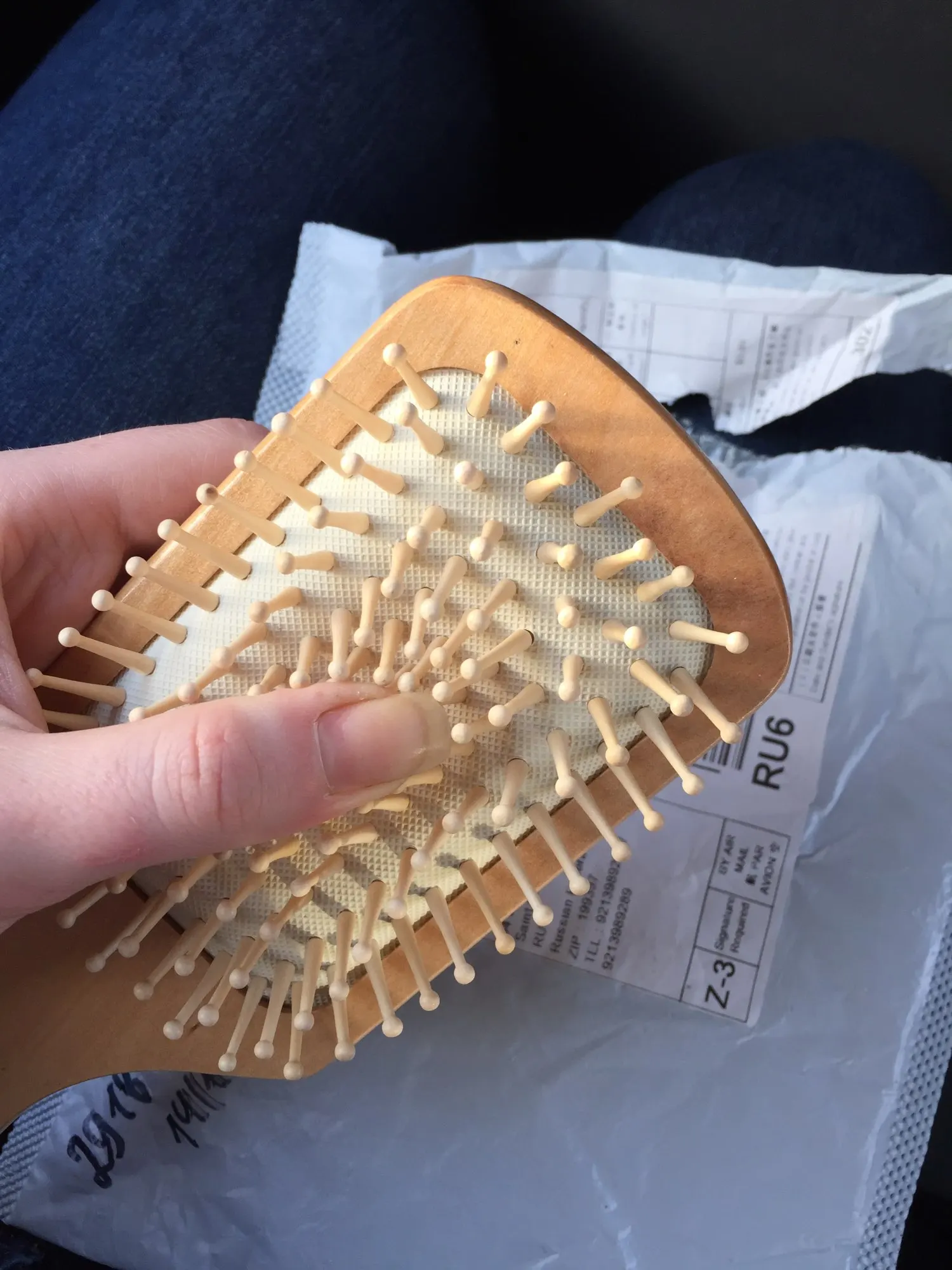 Очень довольна, расческа хорошая, волосы не дерет, расчесывает мягко. Большая, удобно сидит в руке, доставка две с половиной недели в Израиль.