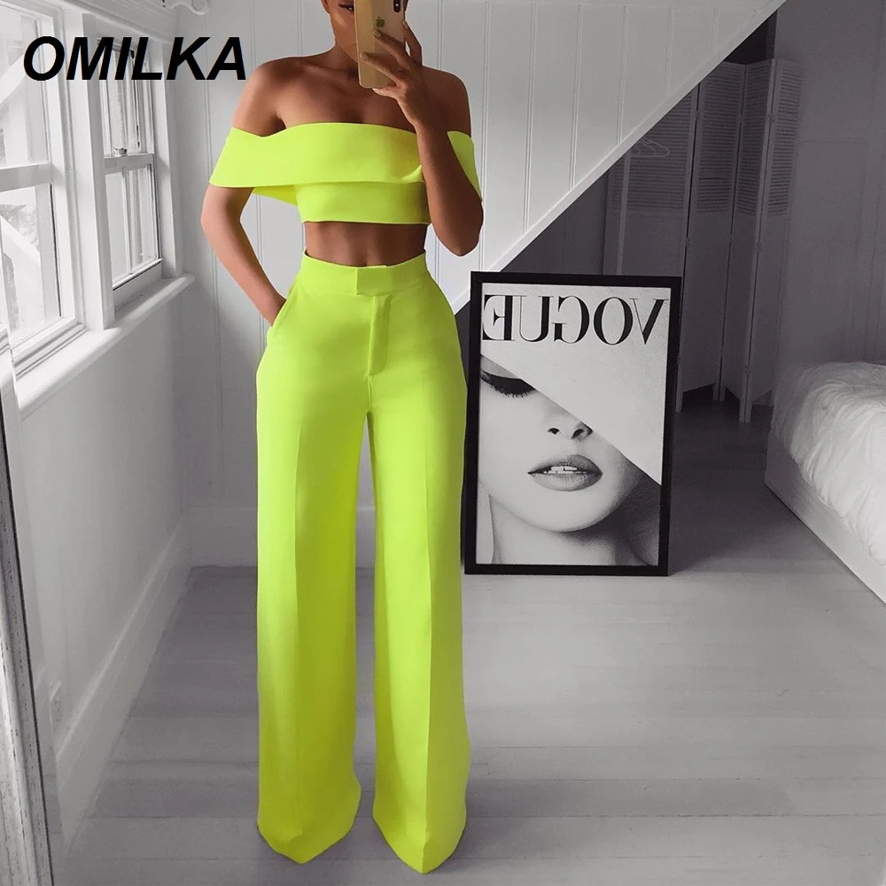 Женский комплект из 2 предметов OMILKA, блестящий зеленый топ с открытыми плечами и широкие брюки, осень 2019
