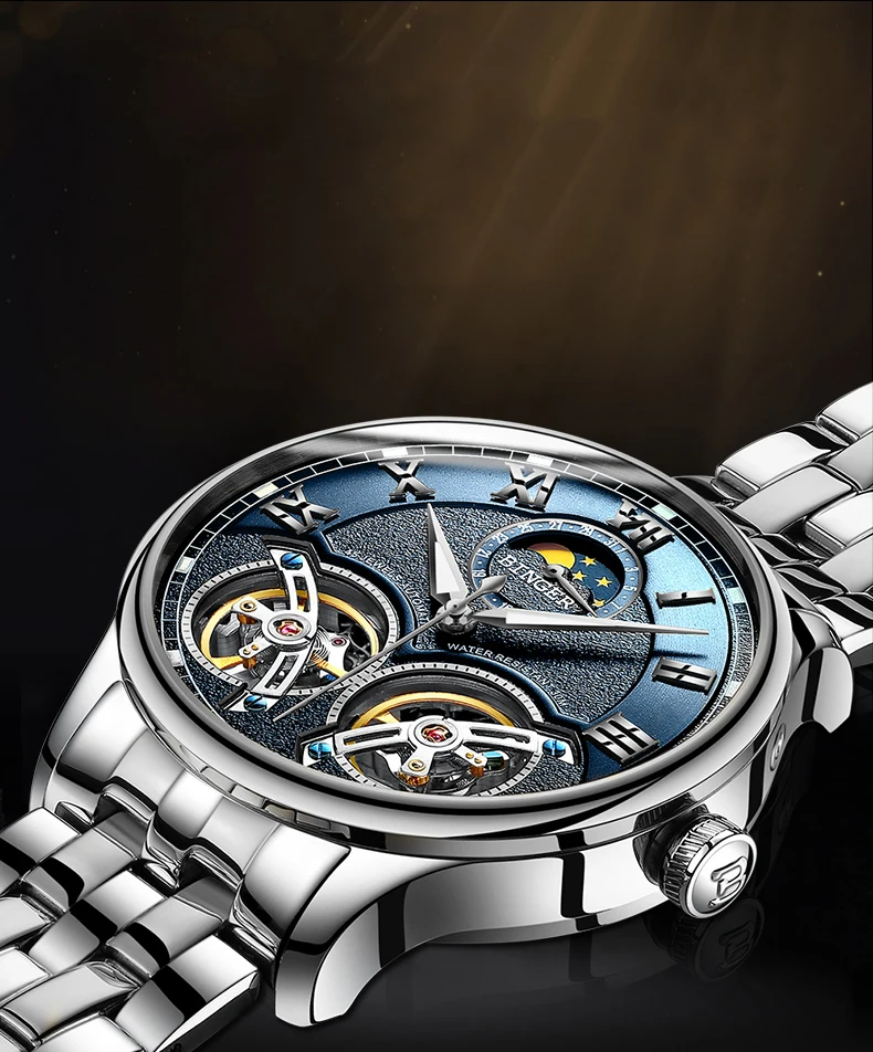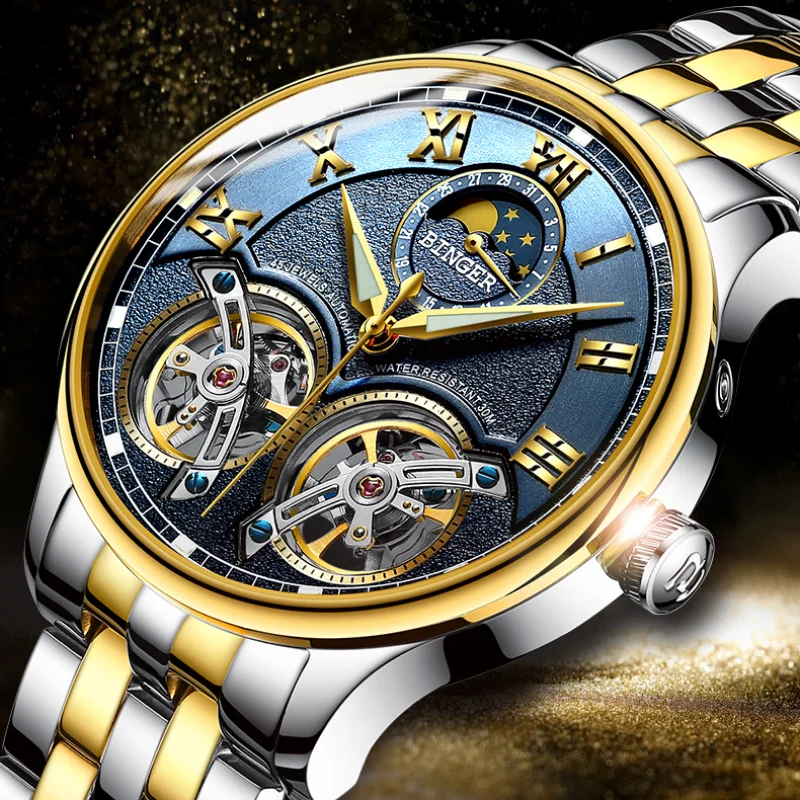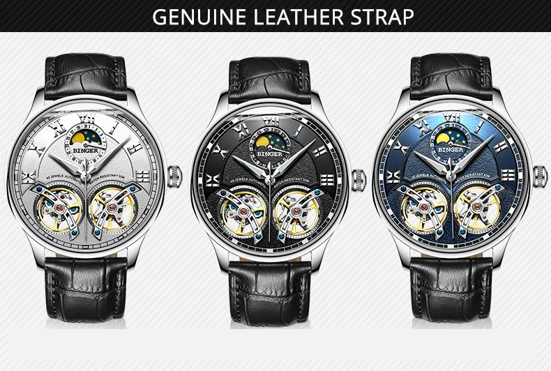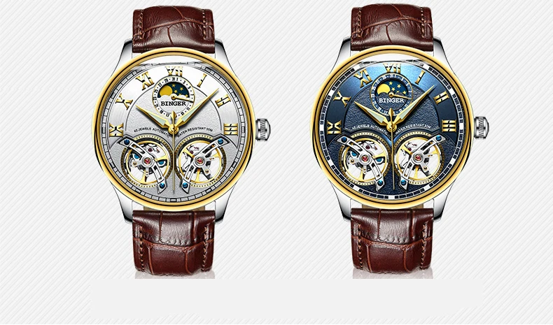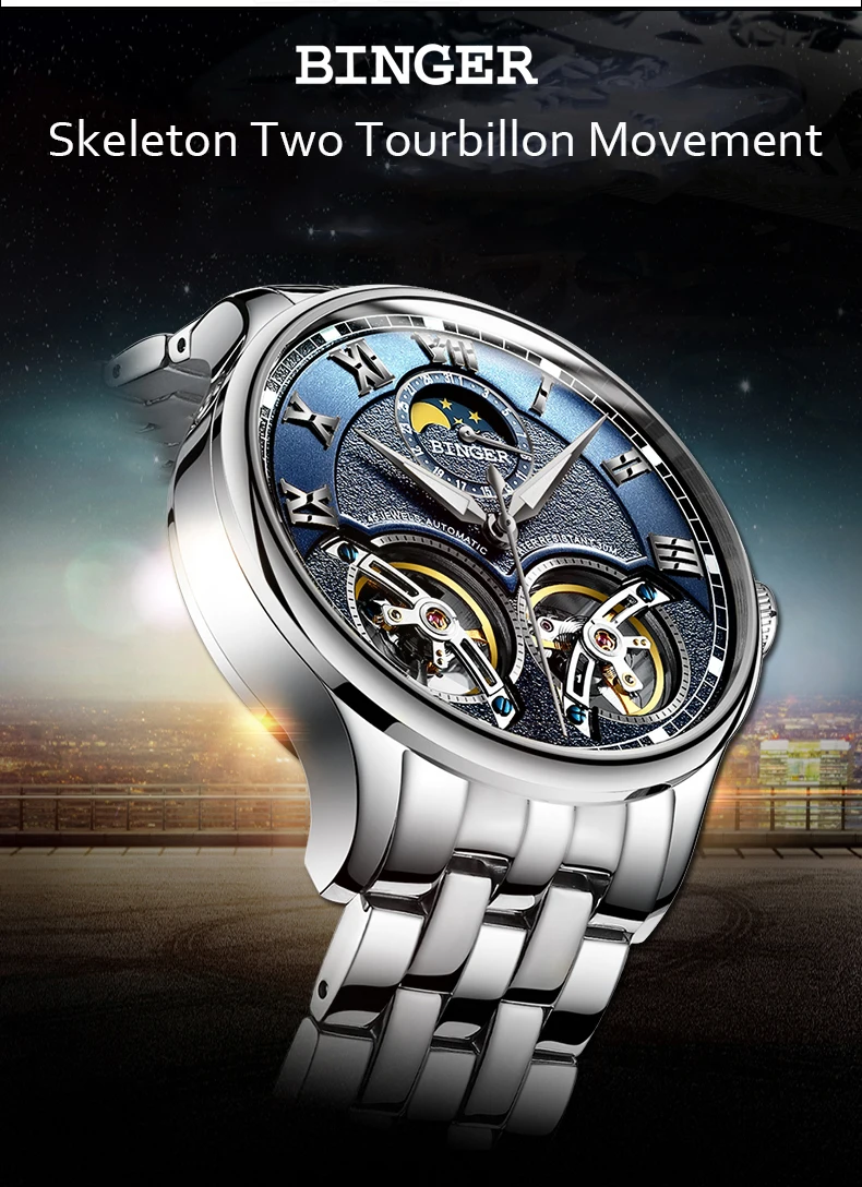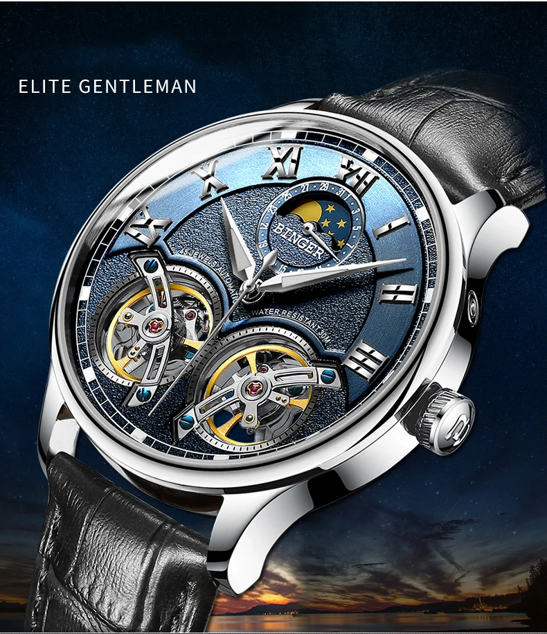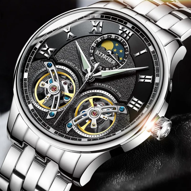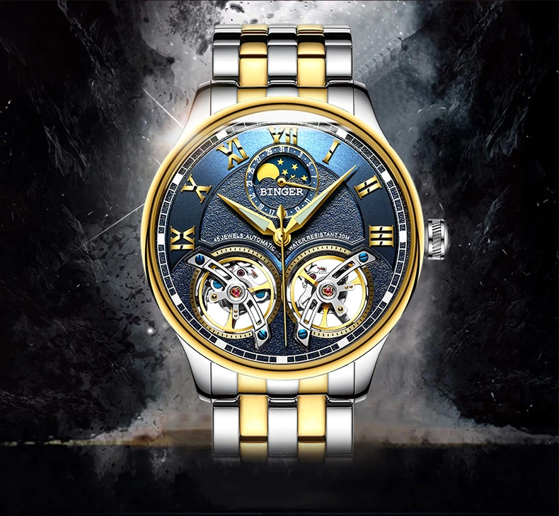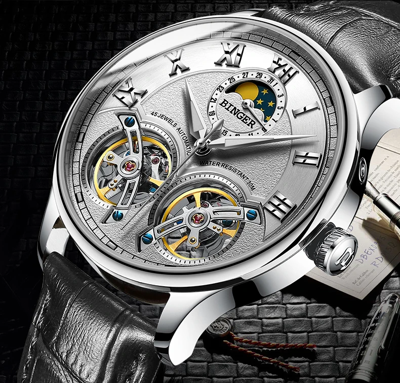 Швейцарские мужские часы BINGER с турбийоном, автоматические Модные механические часы-скелетоны с Лунной фазой, водонепроницаемые светящиеся мужские часы
