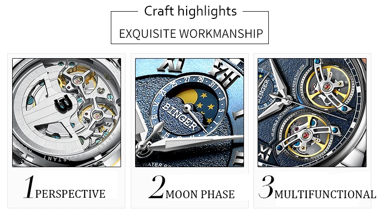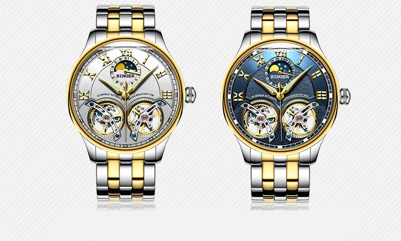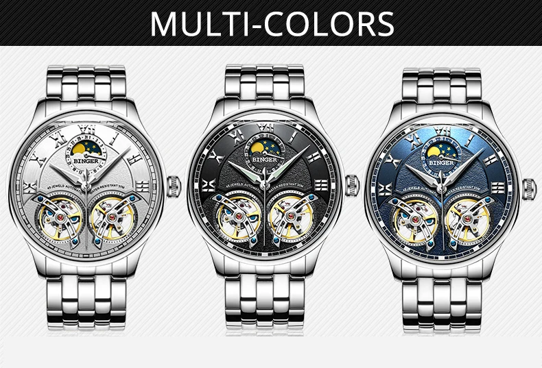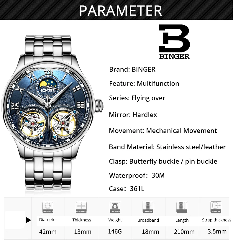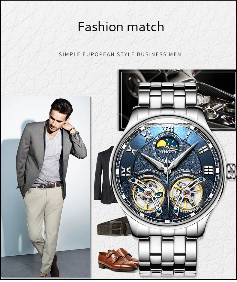 Switzerland BINGER мужские часы tourbillon автоматические Модные механические часы Moon Phase водонепроницаемые светящиеся часы Montre homme