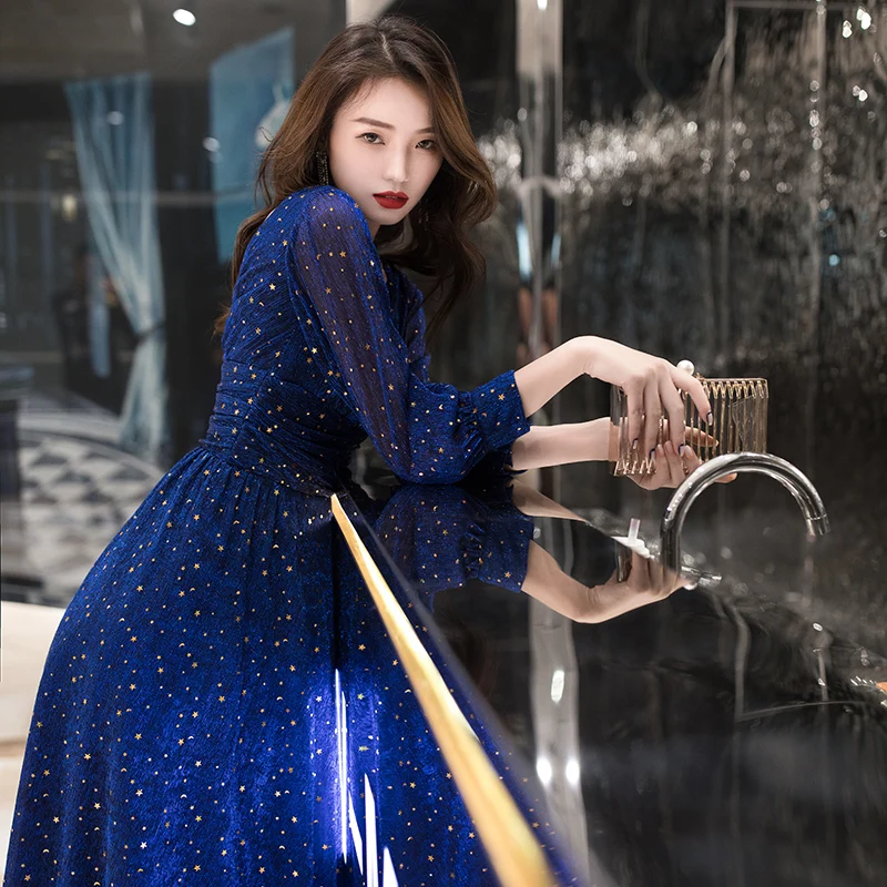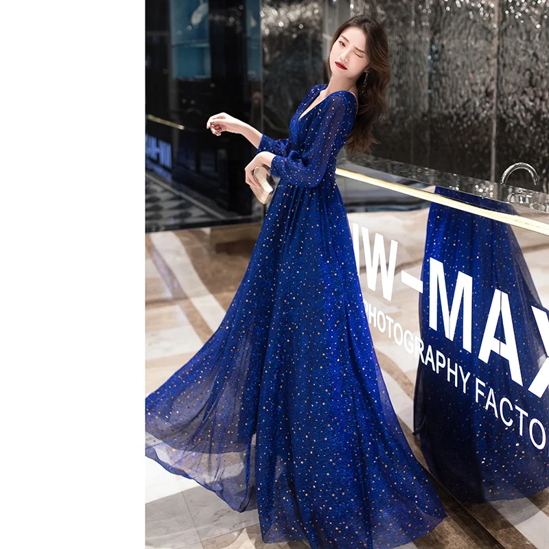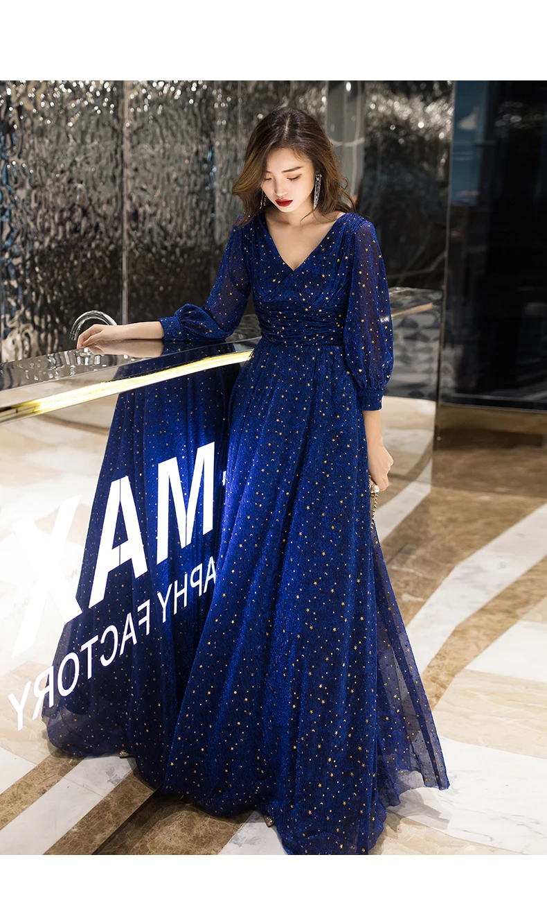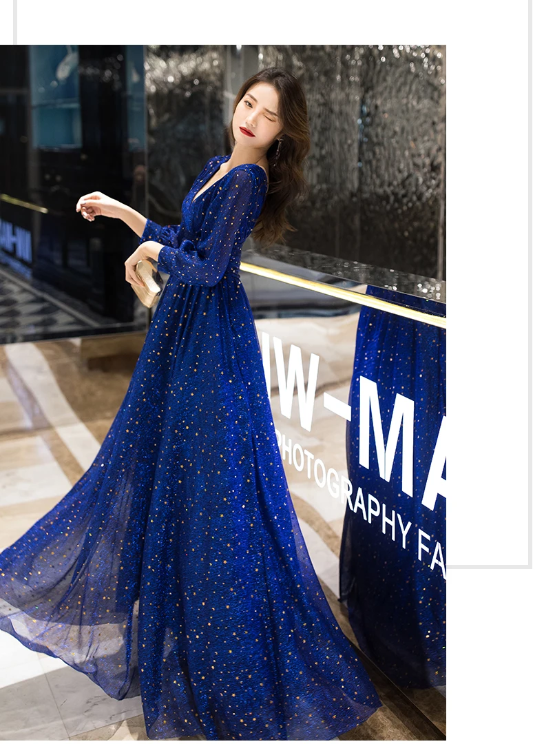 Синие длинные вечерние платья-трапеции AE665, элегантные Серебристые официальные платья с длинным рукавом и V-образным вырезом, платье для вечеринки