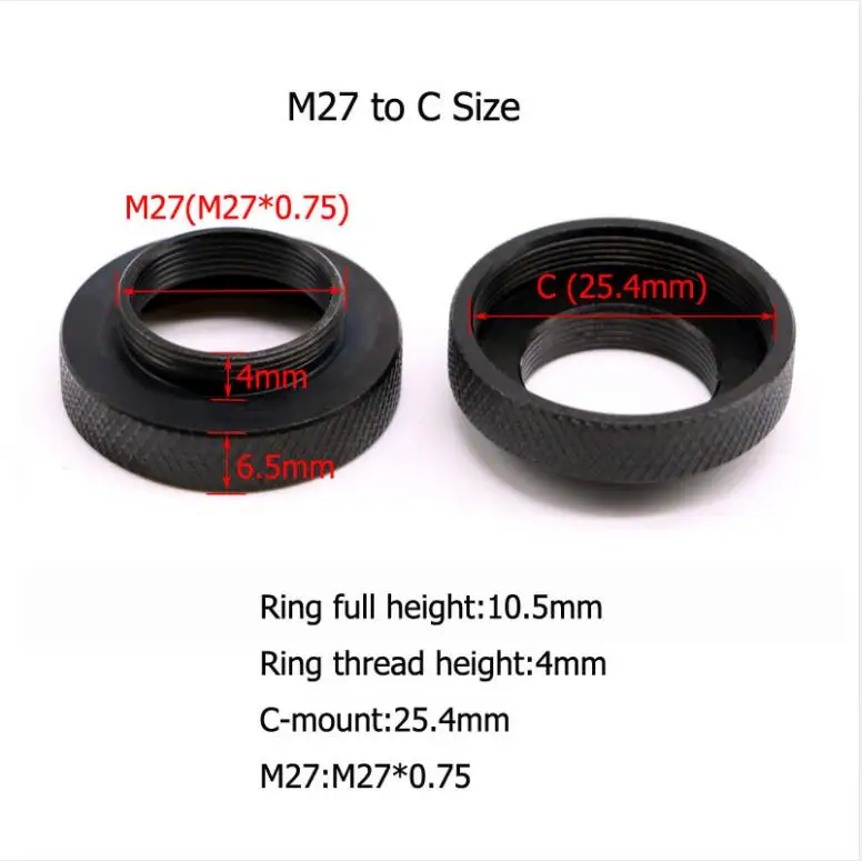 M27 * 0,75 для микроскоп Zeiss Размер объективной резьбы объектива.M31 * 0,75 для некоторого размера адаптера CCD.M42 * 0,75 широко подходит для адаптера SLR камеры.C-крепление широко подходит для размера адаптера камеры CCD.Если вы не уверены в размере кольца адаптера, пожалуйста, сообщите мне размер резьбы объектива и бренд микроскопа, тогда я дам вам несколько советов. Большое спасибо.