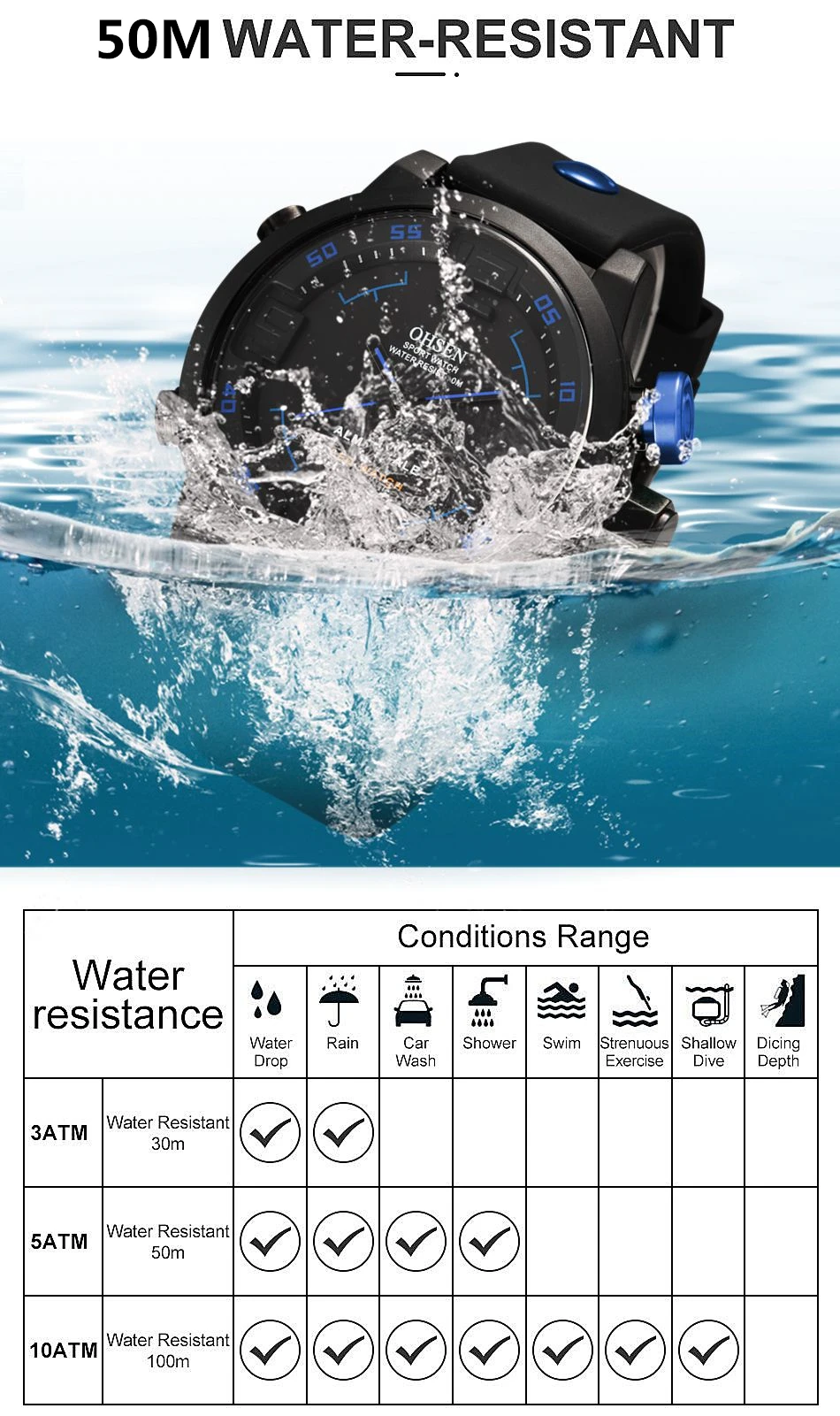 12/24 формата отображения времениЦифровой: часы, минуты, секунды, дата, день, год функция будильникаВодонепроницаемость до 50 м (не нажимайте кнопки в воде)Дополнительная функция подсветки ЖК-дисплея для четкого отображения времени в темноте