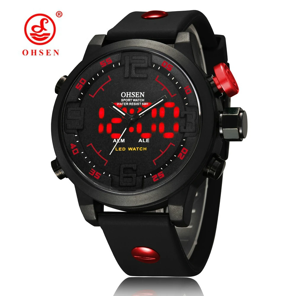 Часы наручные OHSEN Мужские многофункциональные, модные спортивные красные цифровые водонепроницаемые в стиле милитари, 5 бар
