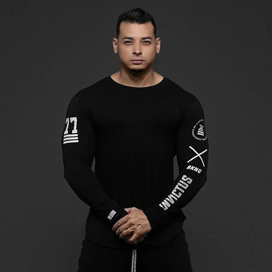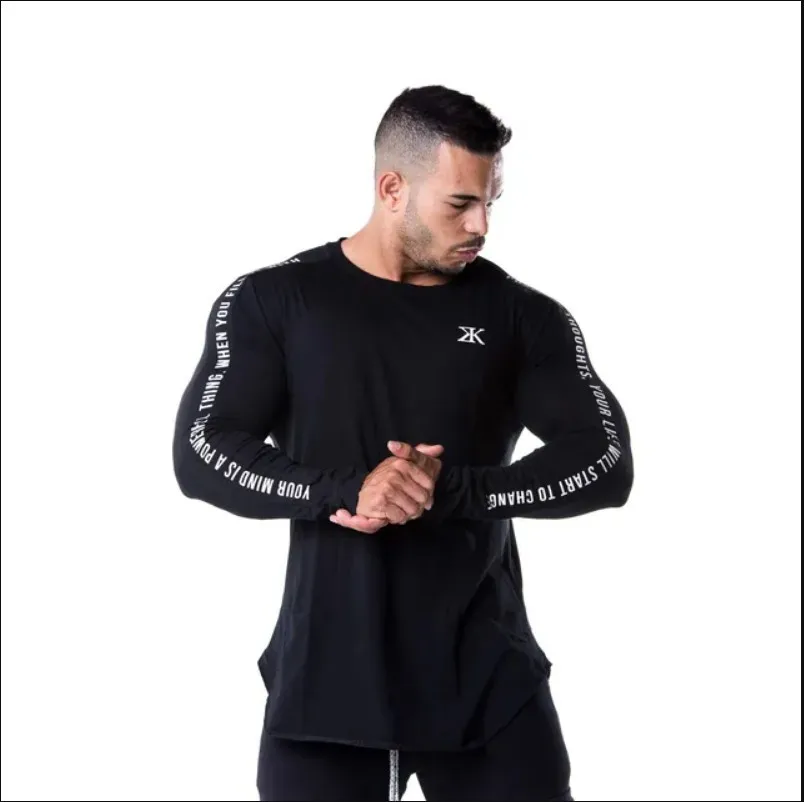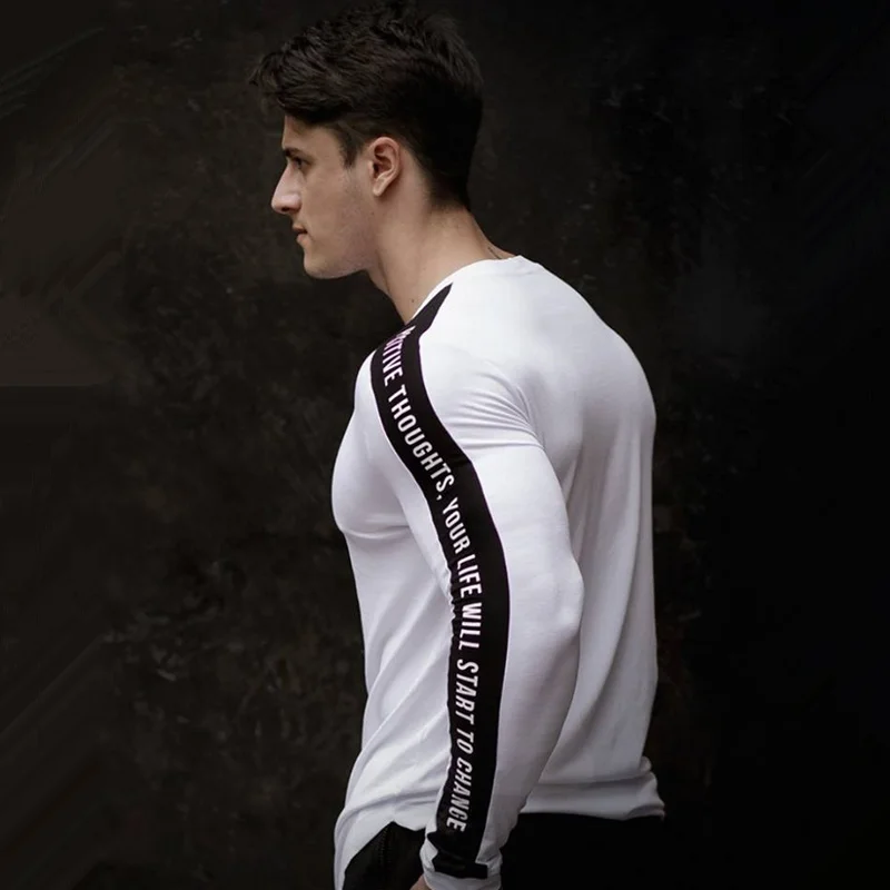 Мужские облегающие рубашки с длинным рукавом, весна 2019, Повседневная модная футболка с принтом, мужская спортивная черная футболка для фитнеса, топы, брендовая одежда
