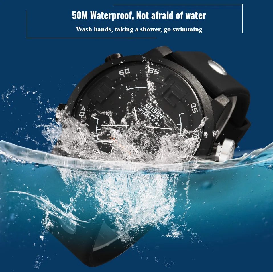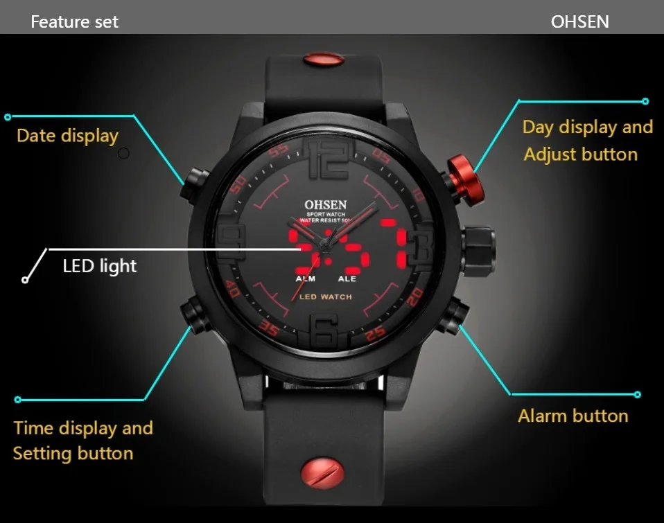 12/24 формата отображения времениЦифровой: часы, минуты, секунды, дата, день, год функция будильникаВодонепроницаемость до 50 м (не нажимайте кнопки в воде)Дополнительная функция подсветки ЖК-дисплея для четкого отображения времени в темноте