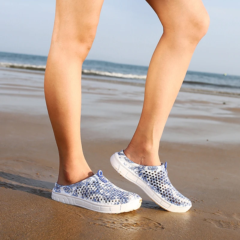 Женские летние пляжные шлепанцы, синие и белые дышащие сетчатые шлепанцы с принтом, массажные шлепанцы размера плюс 41