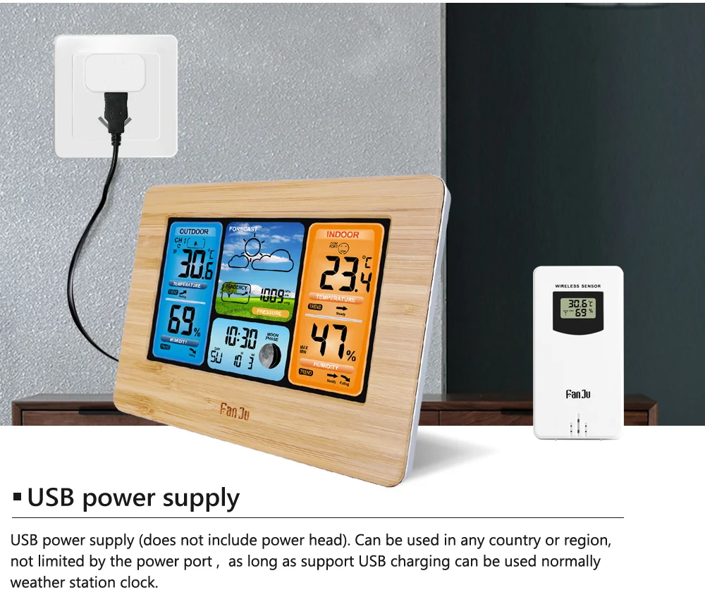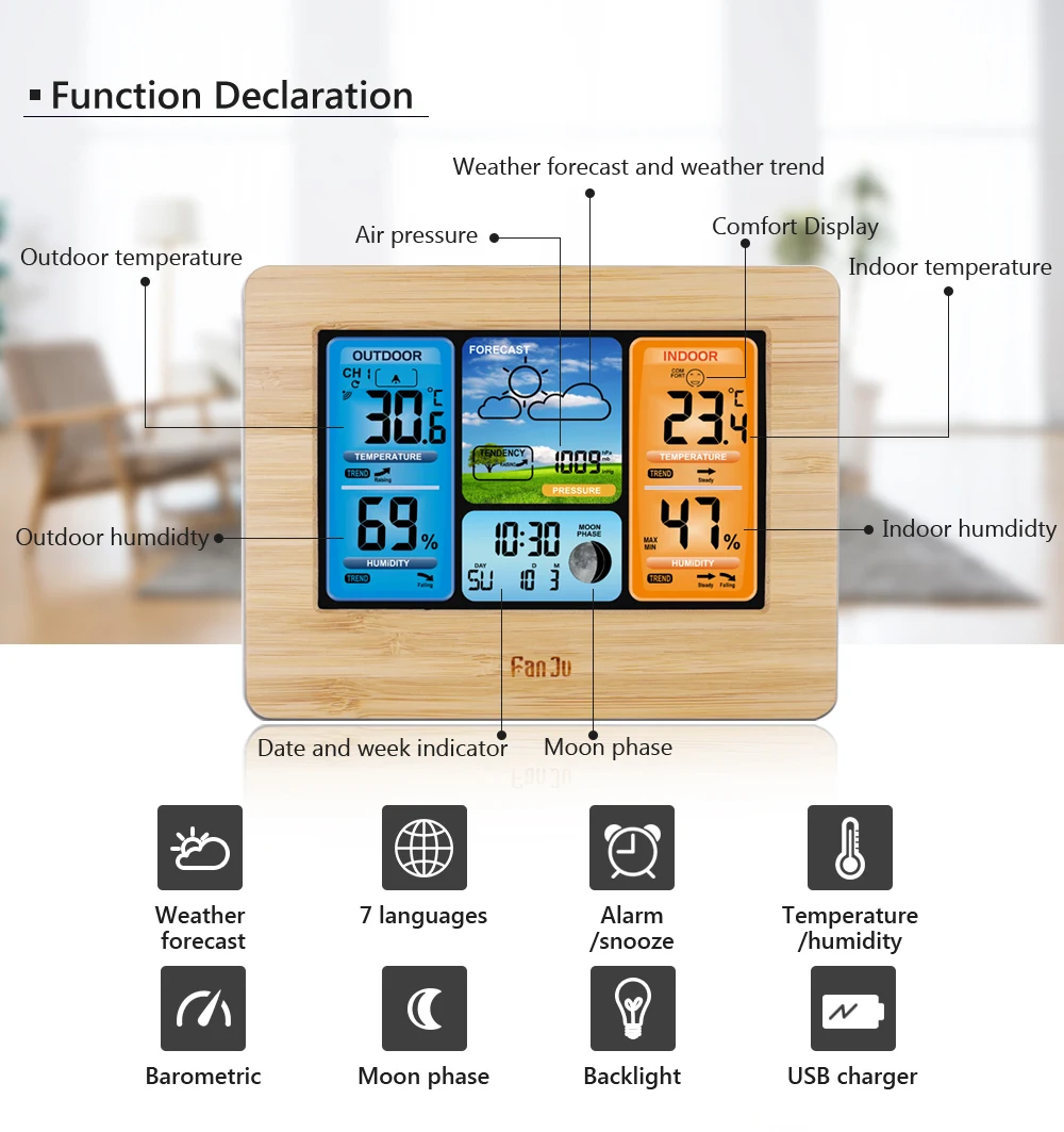 Многофункциональная цифровая метеостанция FanJu FJ3373 с будильником. С термометром, гигрометром и барометром Настройте беспроводной датчик. Данные можно использовать для прогнозирования погодных условий в будущем. Это не только дает вам знать время и календарь, но и поможет вам в жизни. Подходит для разных мест, будь то на столе или на стене. Простой и современный дизайн-отличный инструмент и домашний декор.