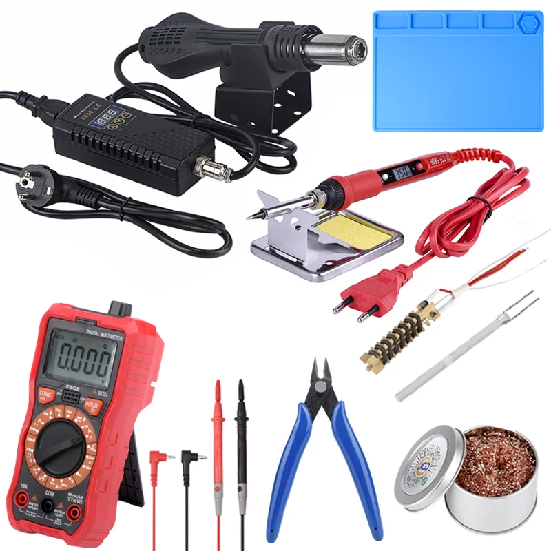 В комплект входят: 1 * пистолет горячего воздуха 8858 1 * паяльник 908S 1 * Цифровой мультиметр 1 * подставка для паяльника 1 * soldeirng железная чистая медная проволока 2 * нагреватель железного элемента 1 * диагональные плоскогубцы