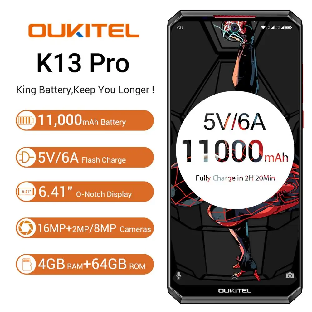 Смартфон OUKITEL K13 Pro Android 9,0 Touch ID NFC, сканер отпечатка пальцев, мобильный телефон 6,41 "19,5: 9 экран MT6762, 4 Гб RAM, 64 ГБ ROM 5V/6A 11000 мА-ч