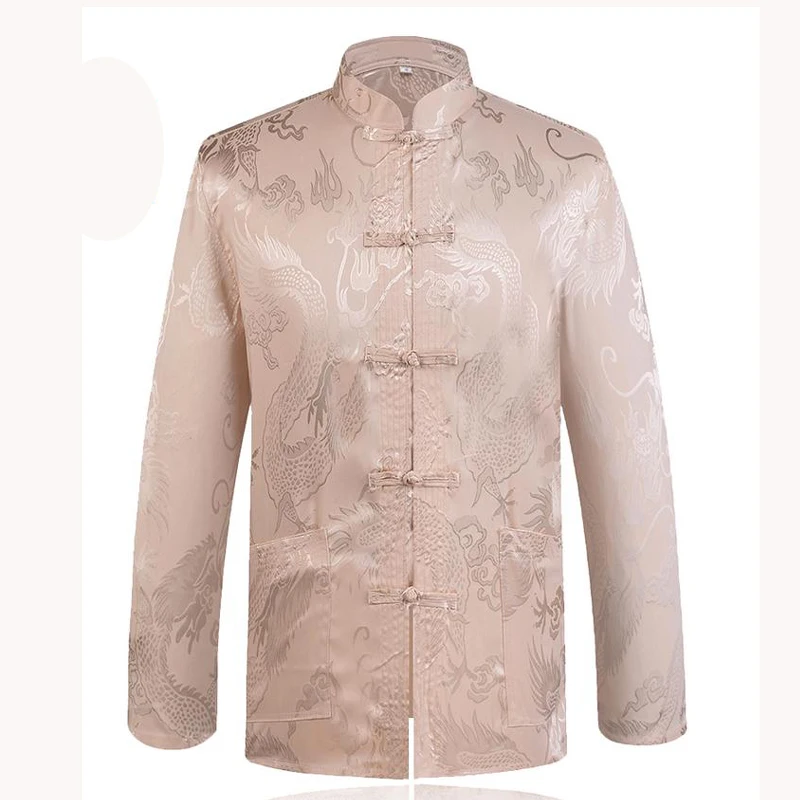 Новое поступление, традиционный китайский Мужской Атласный Костюм Тан с воротником-стойкой из дракона и шелка, куртка Кунг-фу, пальто, повседневная домашняя одежда