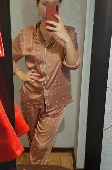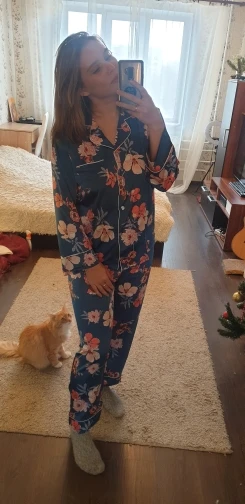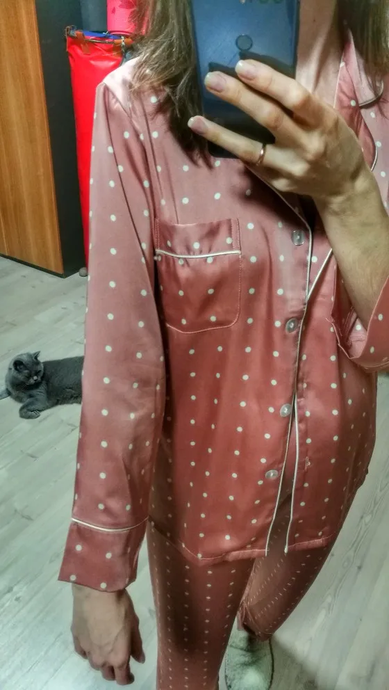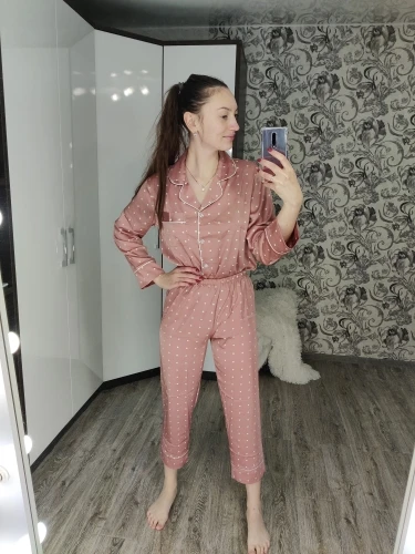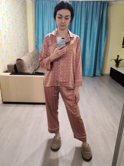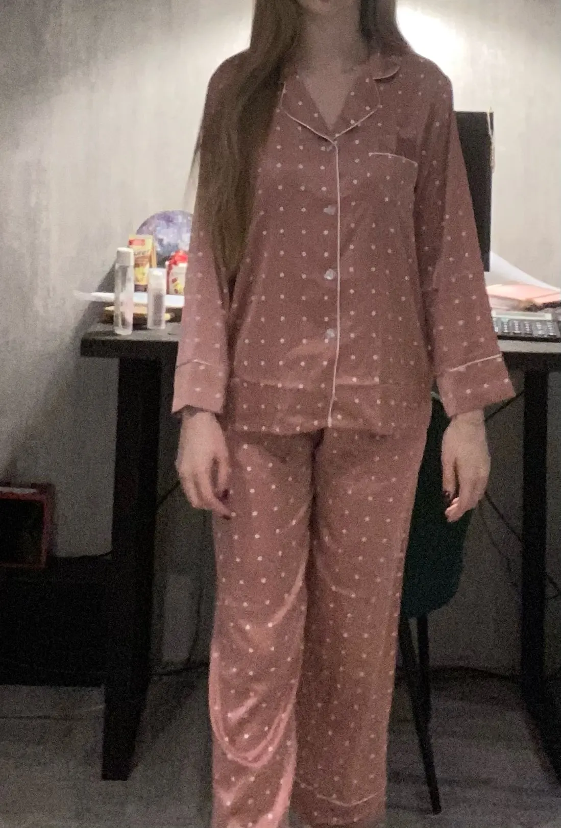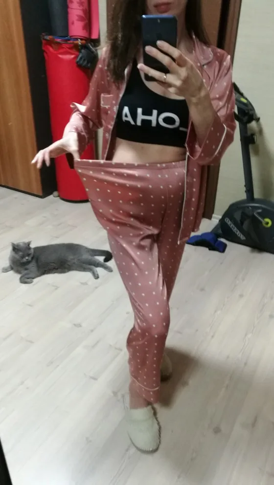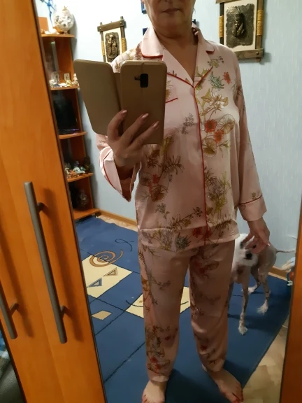 Пижама понравилась, очень приятный к телу, легкий, искусственный шёлк. Маломерка конечно, но начитавшись отзывов на свой рост 168см и вес 58кг, взяла XL, по моим ощущениям для оверсайс можно было и XXL, но мужу понравилось как на мне сидит. Рукава и длина штанов тютелька в тютельку