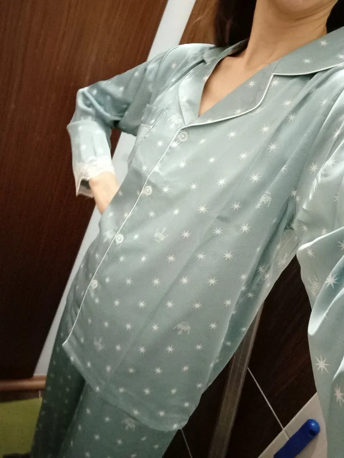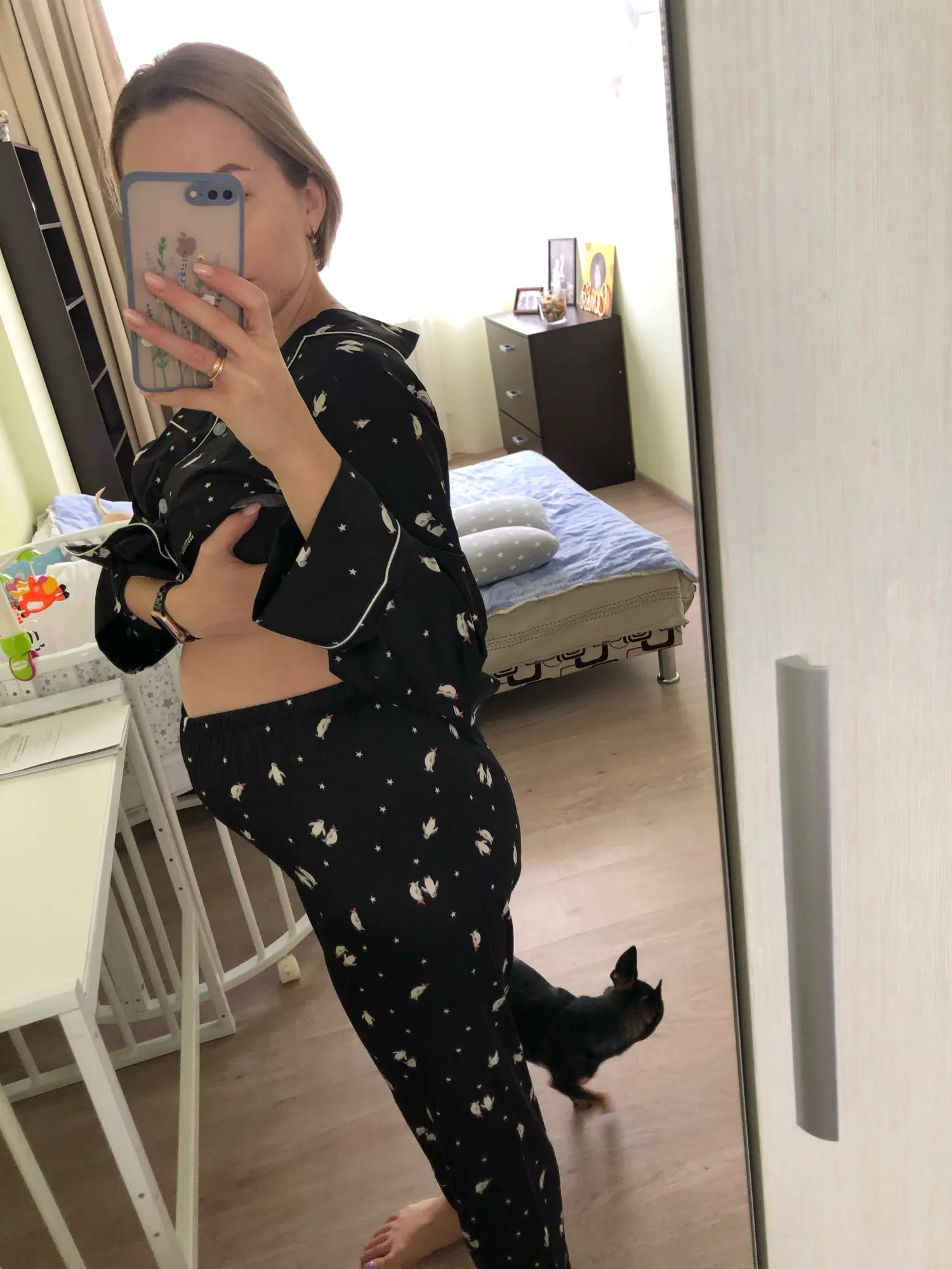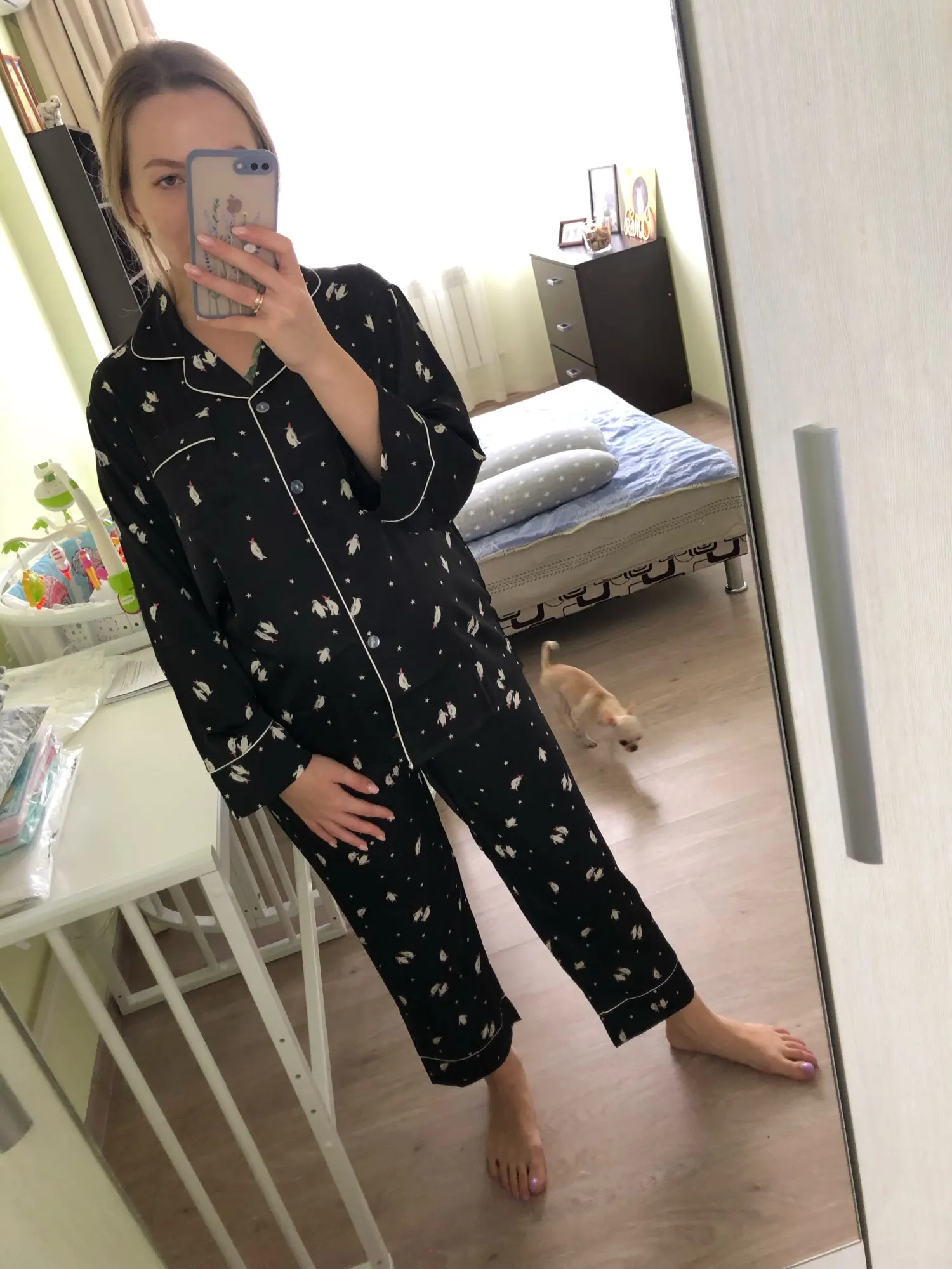 Классная, нежная пижама. Сшита очень качественно. После отпаривания остались кое где разводы, но это ожидаемо для такой ткани и цвета. На мои параметры 94 ог, 93 об и беременный живот 20 недель подошла супер. Плечи 38 и сидит L отлично, свободно. Резинка не тугая, чему я несказанно рада. Рост 160 и если спустить штаны ниже талии, то будут по длине в самый раз, наверно, но я бы ещё длиннее предпочла. Доставили пижаму очень быстро.