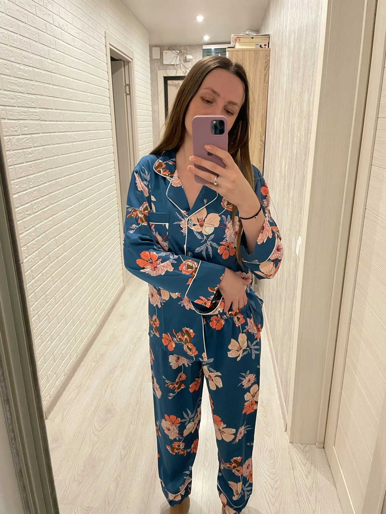Идеальная пижама !!! Любовь с первого взгляда ! Качество супер ! К телу приятно ложиться , не электризуется, закажу ещё парочку однозначно . На 46-48xxl села свободно круто как хотелось