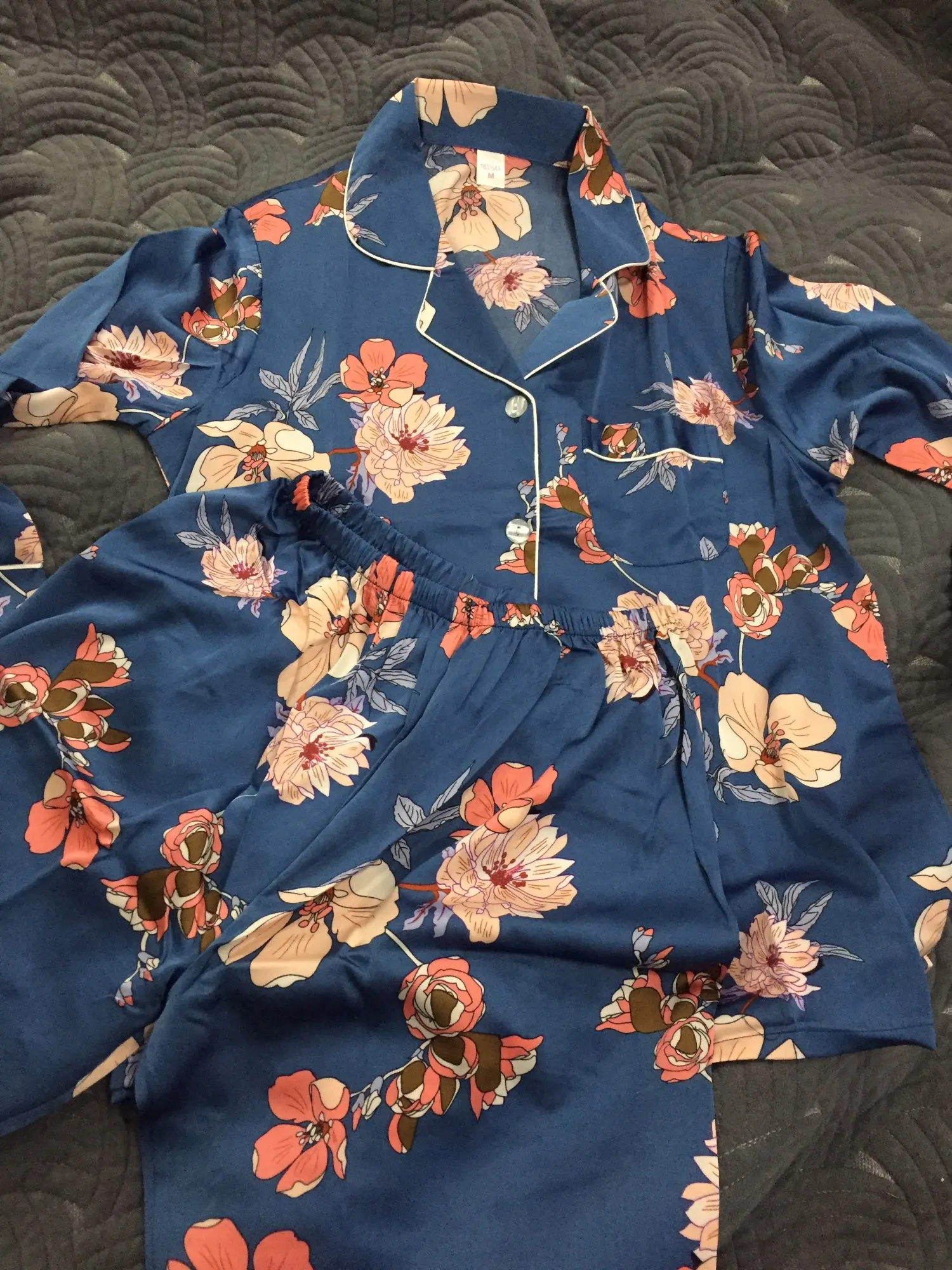 Пижамы очень хорошие, красивые и приятные к телу. Правда на синей пижаме в оригинале были белые пластмассовые пуговицы, которые сильно дешевили еë внешний вид, но если их перешить и заменить на более подходящие по цвету, восприятие кардинально меняется. В подарок продавец положил резинку с бантиком. Доставка в течение месяца. Товар и продавца рекомендую!