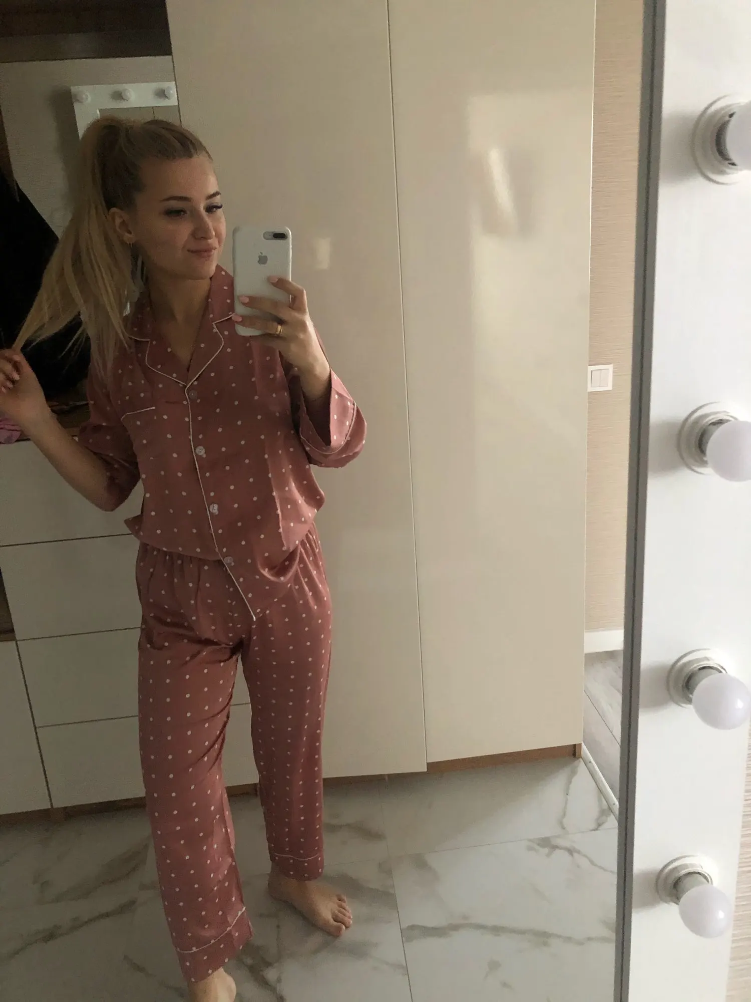 Пижама потрясающая . На фото пижама после трёх стирок: не полиняла , не села. Немного электризуется. Но не сильно. На мои параметры 87:65:89 и рост 160 подошёл размер L отлично. Доставка 2 недели на почту России . Из минусов: первый раз после доставки было сложновато прогладить и при попадании воды остаются пятна, приходится сразу стирать. Но в целом я довольна. Спасибо