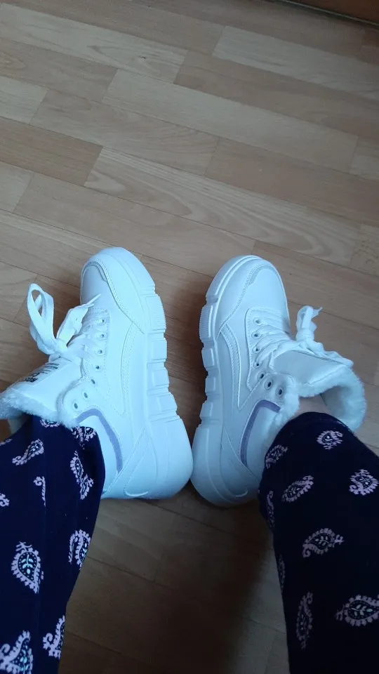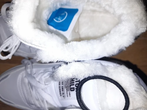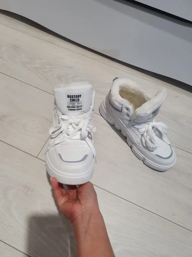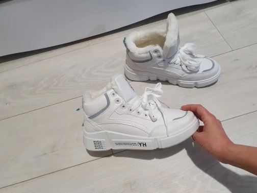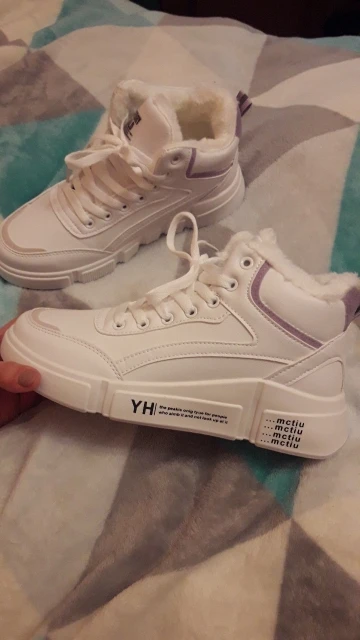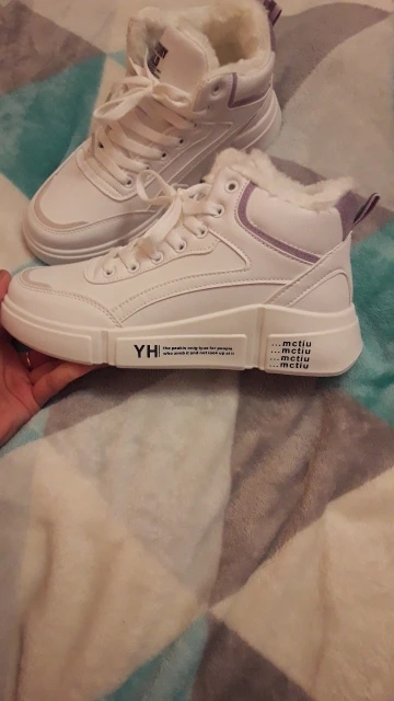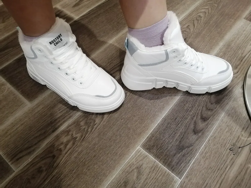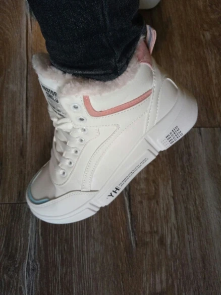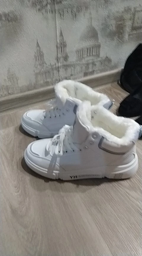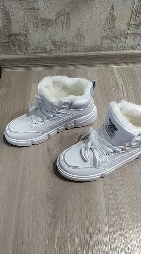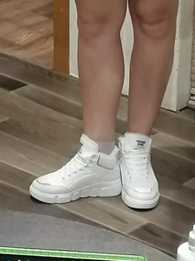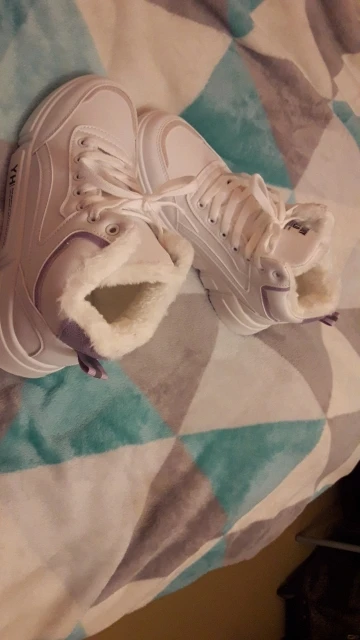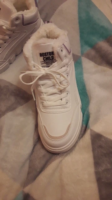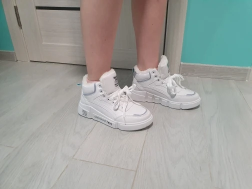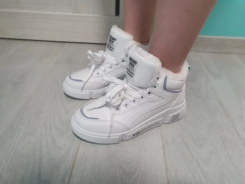 Внешне кроссовки выглядят чудненько, мех искусственный, с виду теплый. Зимой будет видно. По размеру подошли хорошо, но если носить с толстым носком надо брать на пол размера больше. В подарок продавец положил резинку для волос