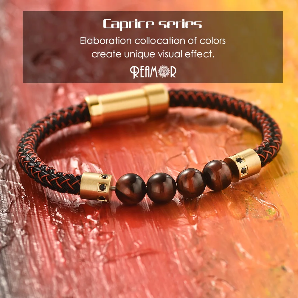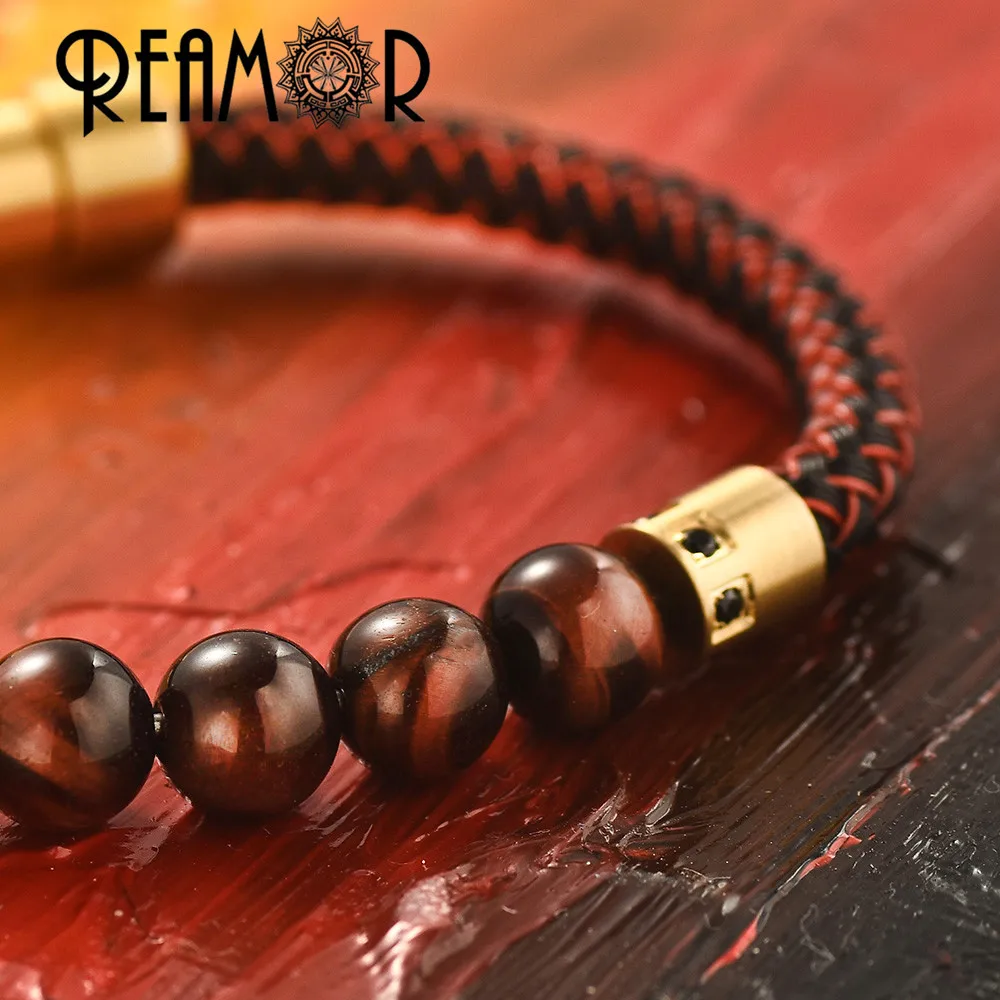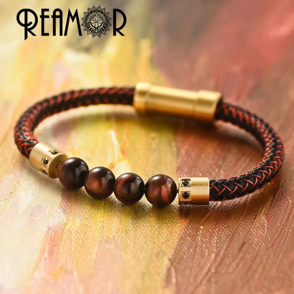 REAMOR, роскошные мужские браслеты, красный натуральный камень, сделай сам, съемная проволочная веревка из нержавеющей стали, браслеты, позолоченный циркониевый браслет для женщин