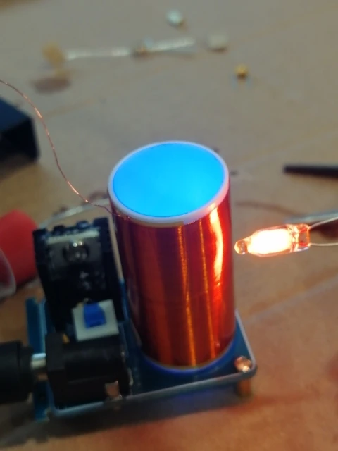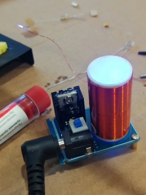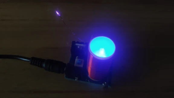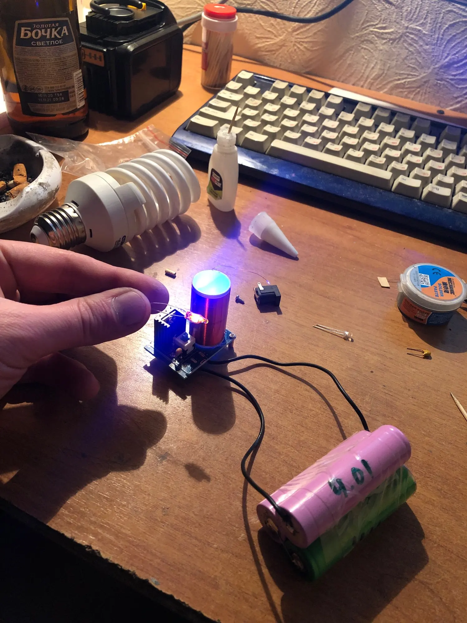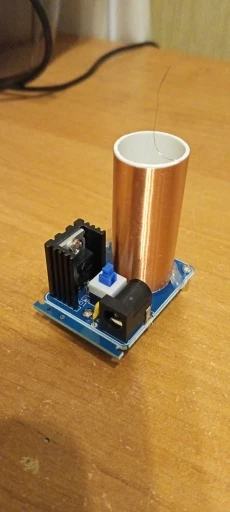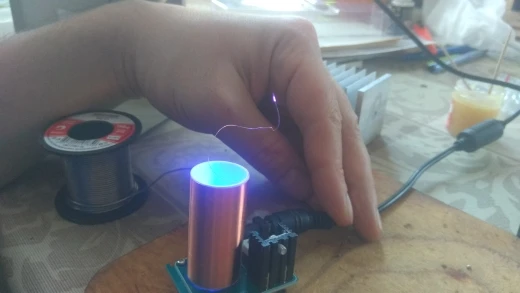 Работает искра не большая. Питал от 19в бп от ноутбука. Спасибо за пятёрку по физике!
