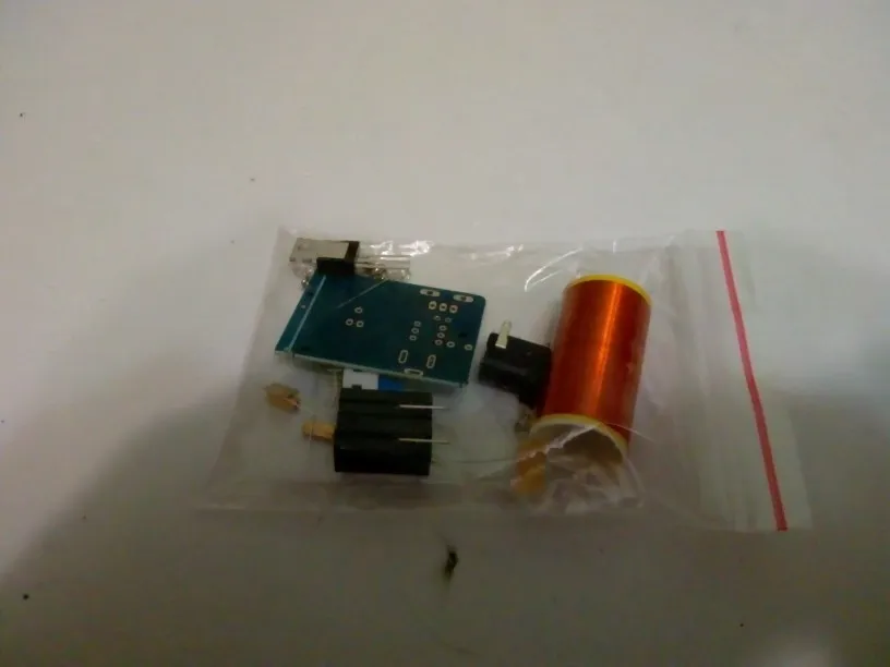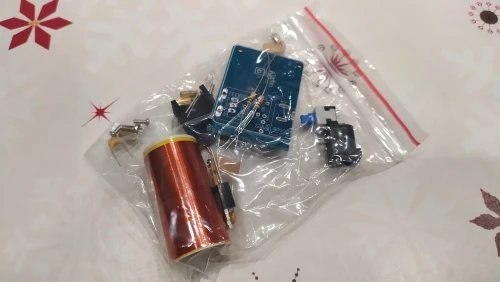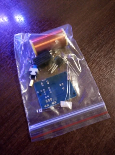 Комплект полный, есть даже запасные светодиод, конденсатор и резистор. Паяется за 5 минут. Схема не нужна, всё обозначено на печатной плате. У светодиода плюсовый вывод подлиннее. Катушку приклеил к плате термоклеем. Генератор достаточно мощный, входящая в комплект неонка начинает светиться в 10 см от катушки. Коронный разряд легко прожигает бумагу. Входное напряжение от 4 до 13В. Транзистор греется сильно, градусов до 70, но это для него допустимо.