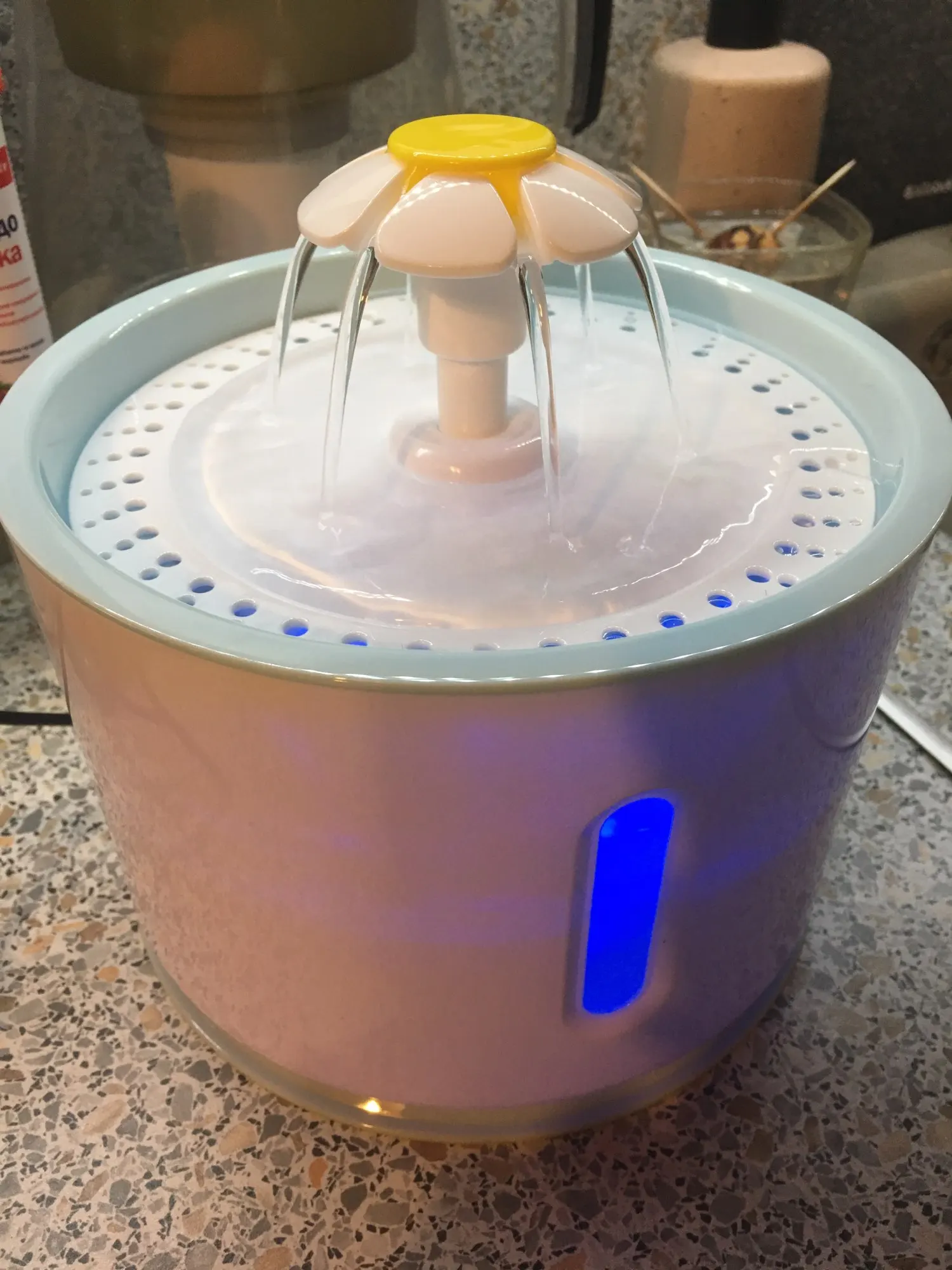 Фонтан отличный! Кошка сразу начала пить из него, пьёт лучше, чем из обычной миски. собрали быстро, конструкция несложная, работает от обычного кабеля со входом usb. красивая голубая подсветка и симпатичный дизайн, в общем мы очень довольны! А особенно наша киса! Общаться с продавцом не пришлось, посылка шла около месяца