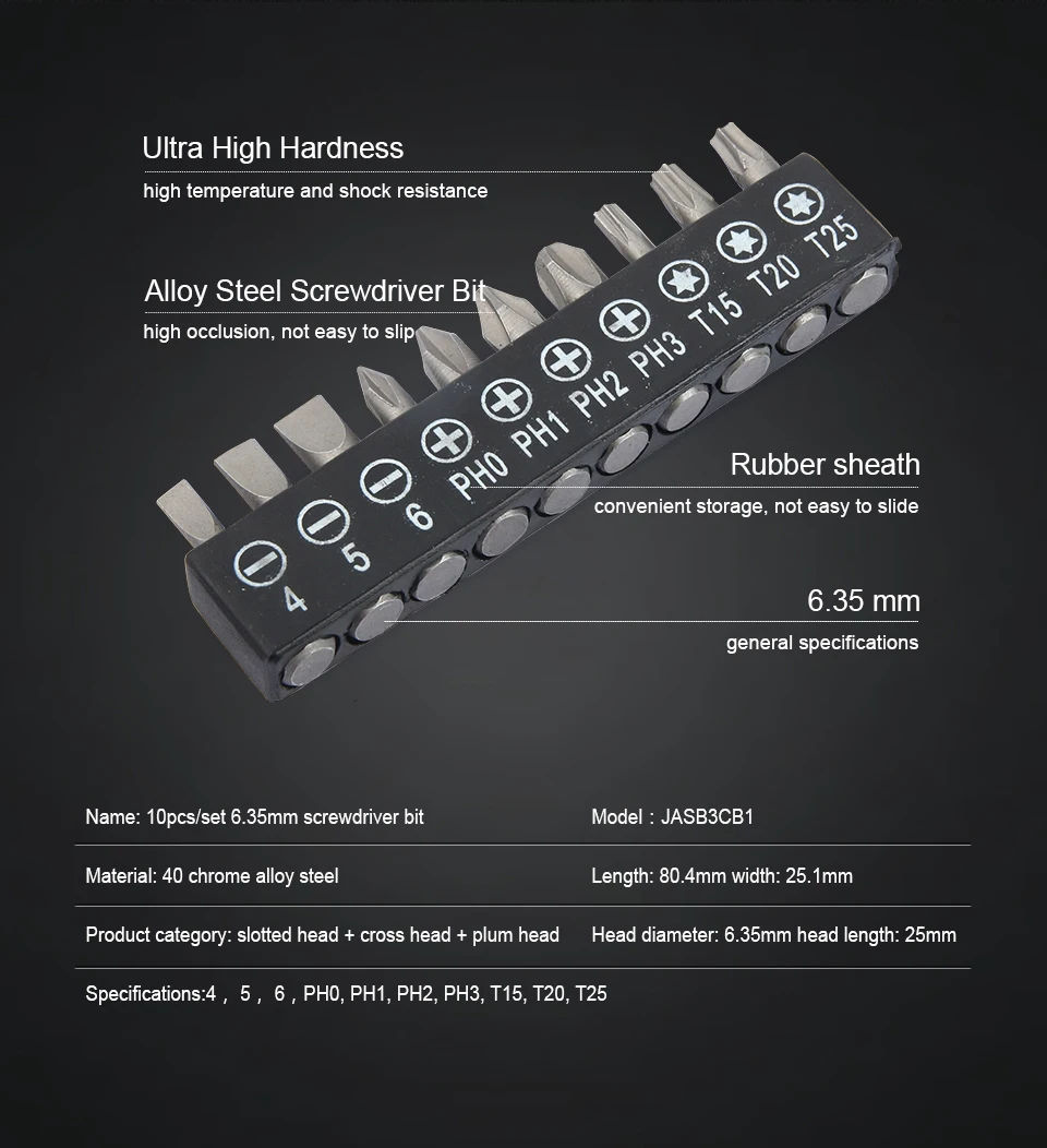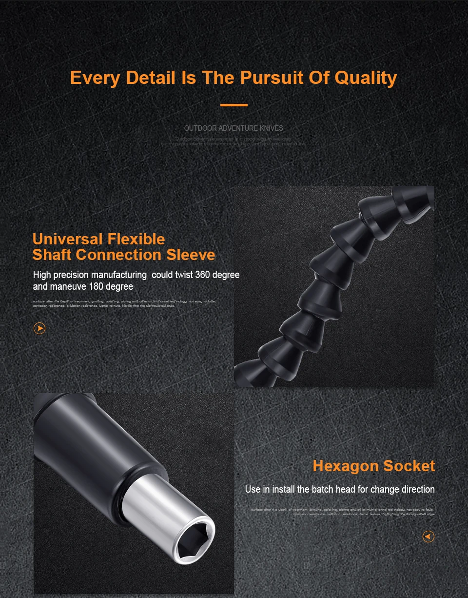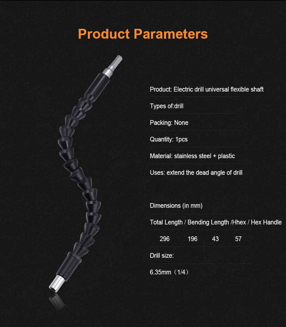 ★Гибкий универсальный удлинитель отвертки, подходит для установки в небольшом пространстве, установки винтов или удаления винтов. Гибкий защитный чехол защищает вашу руку, а внутренний вал вращается. Характеристики: Сверло с гибким валом ① Длина: 11,8 дюйма ② Материал: Высокоуглеродистая сталь + пластик ③ Цвет: оранжевый/черный ④ Шестигранный хвостовик: 6,35 мм (1/4 дюйма) ⑤ Внутренняя Шестигранная головка: 6,35 мм (1/4 дюйма) 10 шт./компл. Набор отверток 6,35 мм ①Материал: 40 Хромовая легированная сталь Категория продукта: Прорезная головка + поперечная головка + Сливовая головка ③ Характеристики: 4, 5, 6,PH0, PH1, PH2, PH3, T15, T20, T25 ④Длина: 80,4 мм Ширина: 25,1 мм ⑤Диаметр головки: 6,35 мм длина головки: 25 мм ☢Примечание: ★Используйте с зарядной отверткой или электрической дрелью (не для ударной дрели В комплект входит: ★1x1/4 "гибкий удлинитель ★10 шт./компл. Набор отверток 6,35 мм ✯ О нас-JelBo Высокопроизводительный продукт В нашем магазине мы гарантируем высокое качество продукции по хорошей цене. Мы отказываемся от продажи дешевых товаров, чтобы вы приобретали у нас долговечные и экономически эффективные товары для дома. Профессиональные услуги В нашем магазине, если у вас есть какие-либо сомнения относительно нашей продукции, пожалуйста, свяжитесь с нами. После того, как вы получите товар, если у вас есть какие-либо вопросы об использовании методов и производительности продукта, мы предоставим вам профессиональное, заботливое обслуживание по продажам.