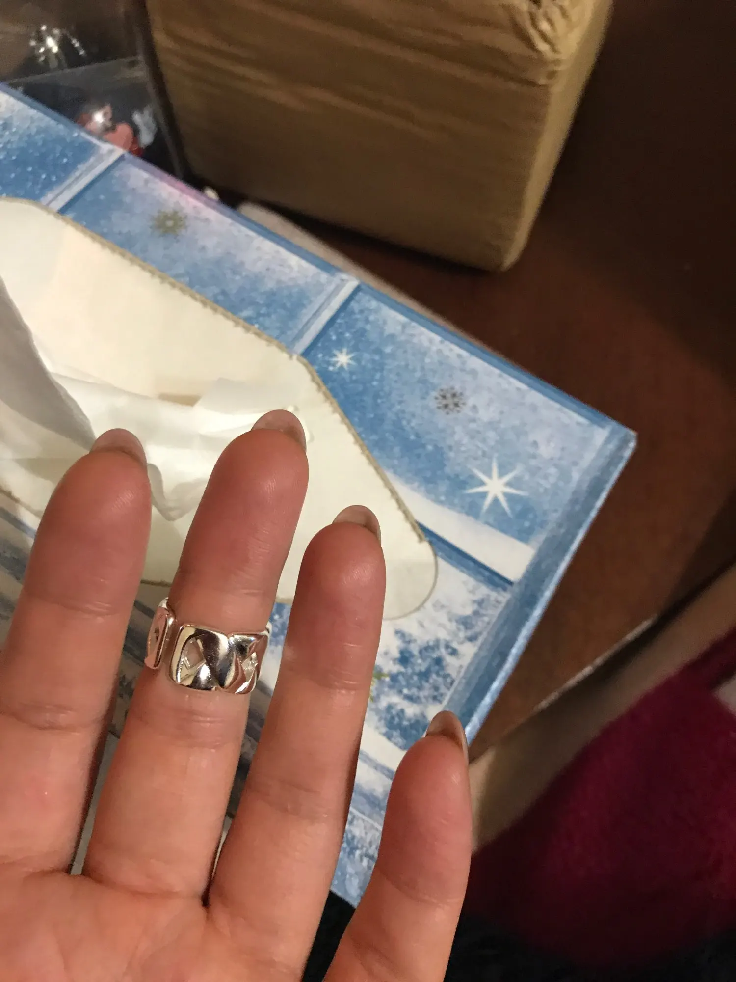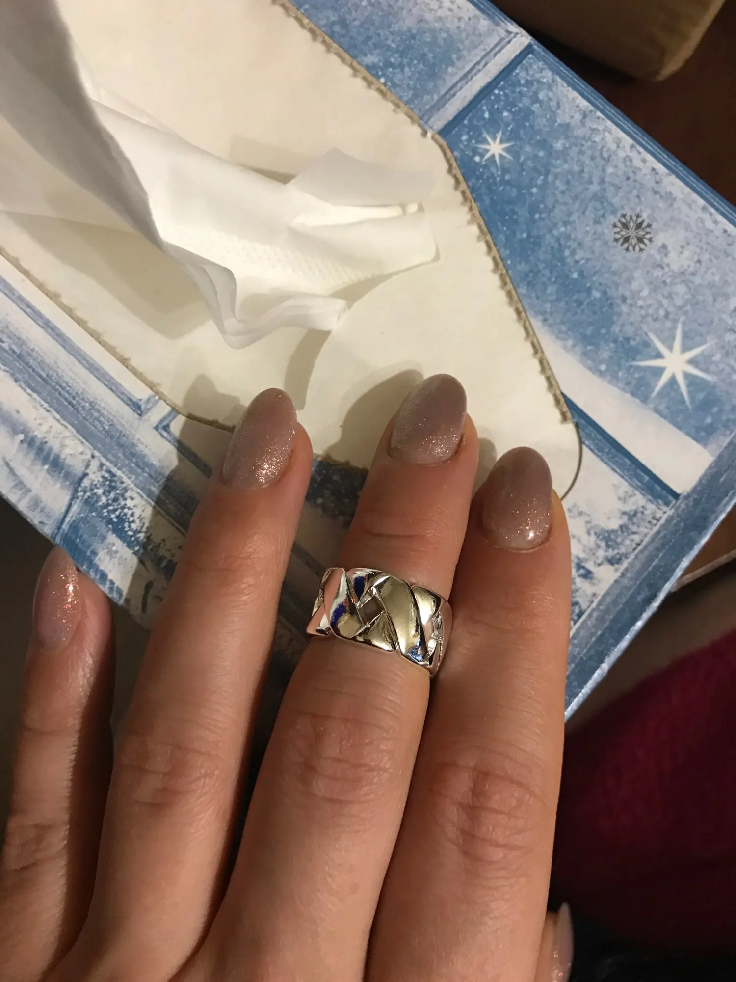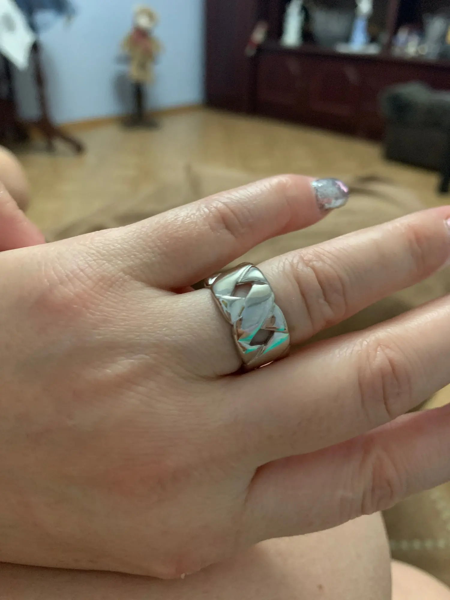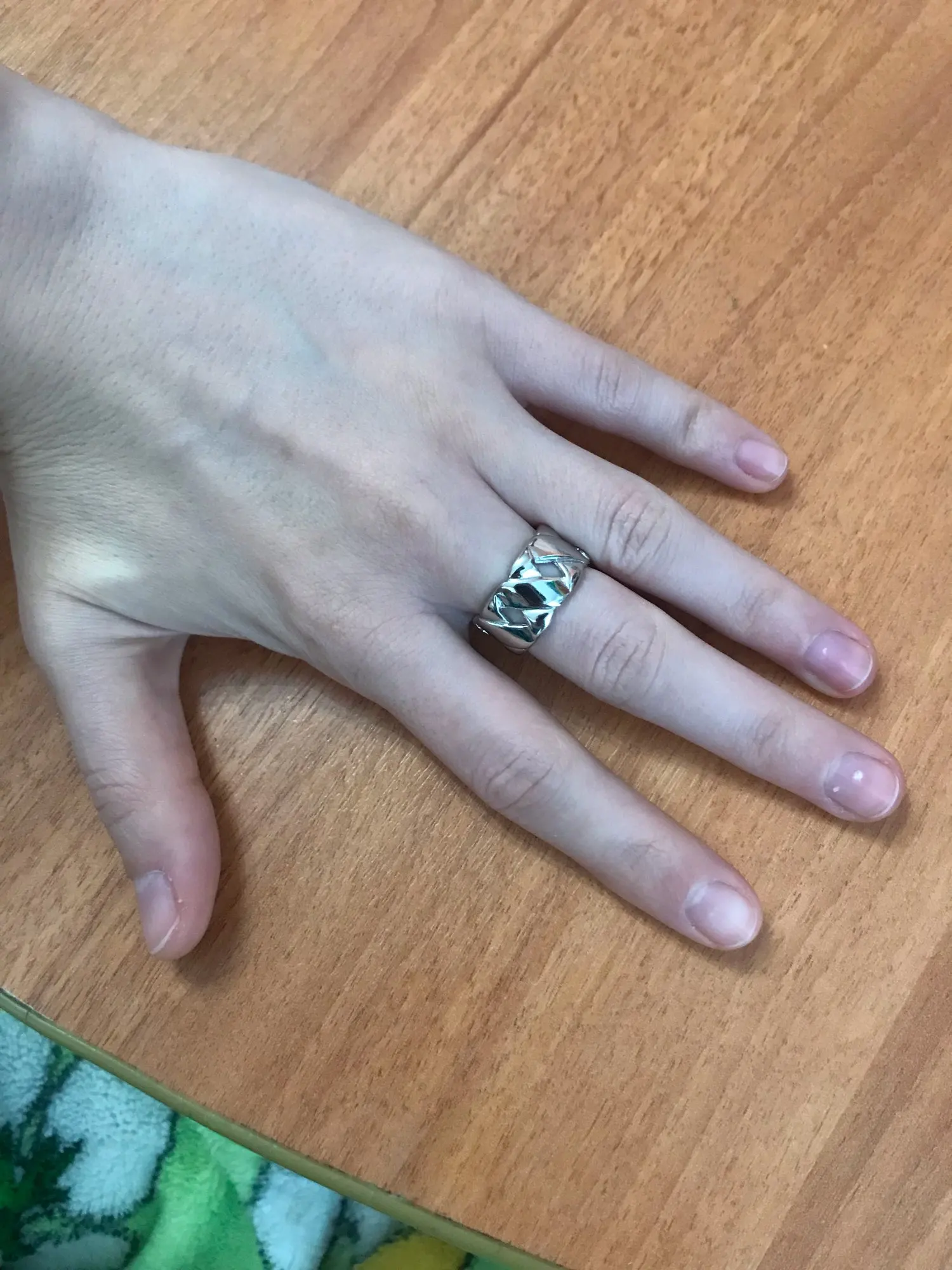Колечко очень красивое, смотрится дорого. Но, к сожалению, оно мне даже на мизинец не налезло до конца. Очень печально, придётся носить его, как кулон, на цепочке.
