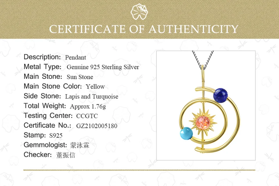 Really nice with 925 stamp on it, but I was aspecting a certificate for stones and metal with item. Hope pendant to result good quality during the use. Fast shipping and good packaging.