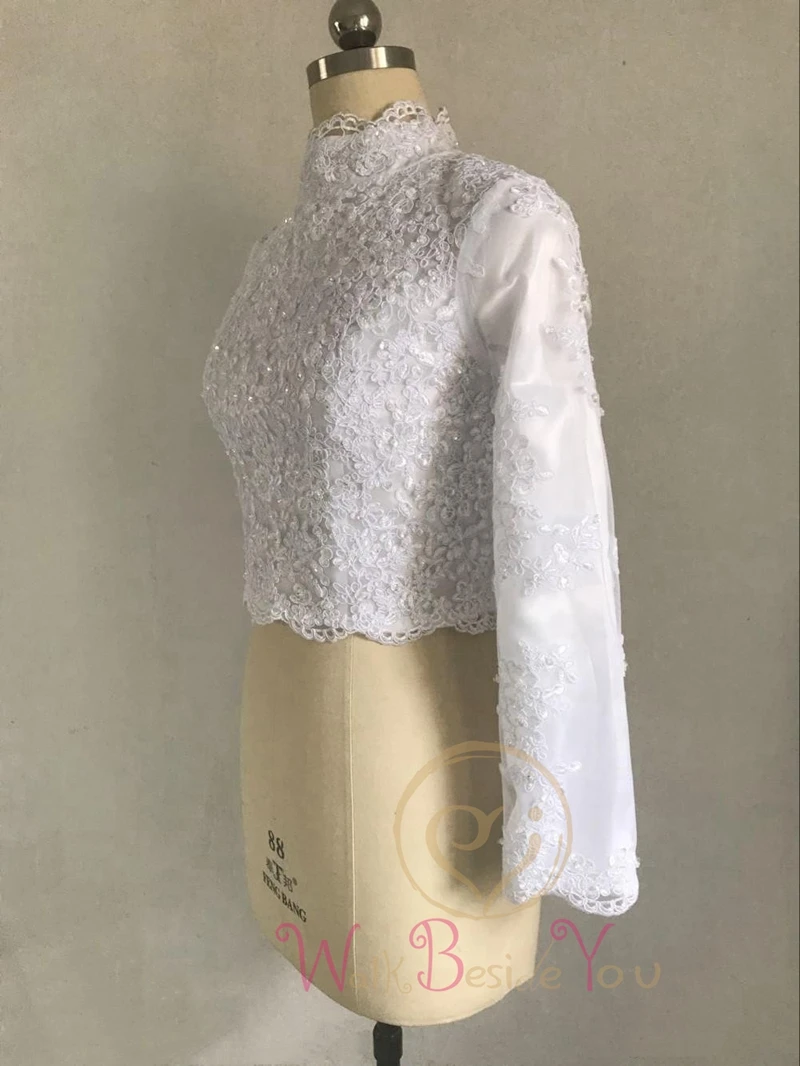 Мусульманские свадебные болеро с подкладкой куртки с высоким воротом цвета слоновой кости/белый с длинным рукавом кружева бисером Свадебная Куртка болеро 2020 элегантные обертывания