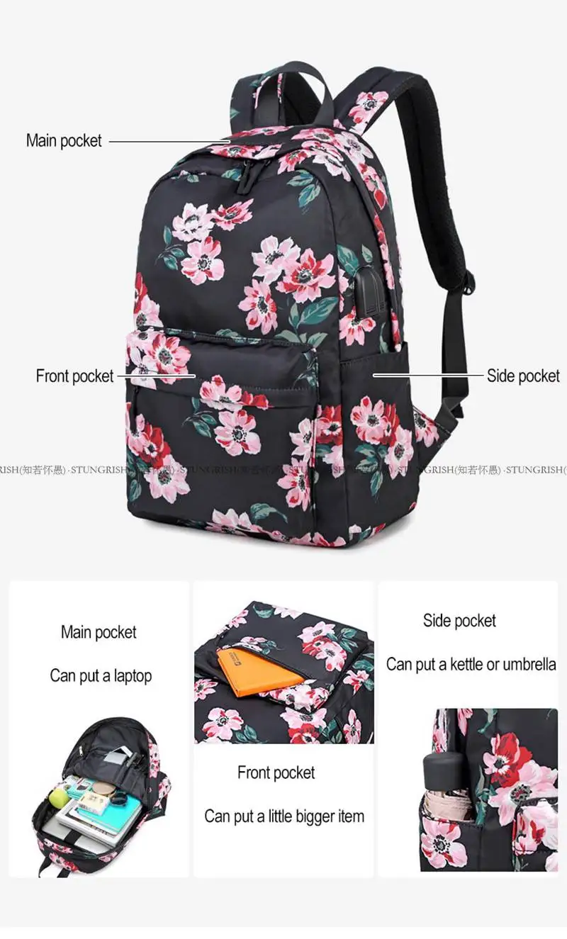 Рюкзак для девочек 3 в 1 комплект: рюкзак + Сумка-тоут + Сумка-карандаш, водонепроницаемый нейлоновый материал не рвет и не рвет, когда вы положите много внутри рюкзака, SBS гладкая молния, которая позволяет чувствовать себя хорошо и легко скользит. Школьный рюкзак для девочек-подростков: размеры 11,8 "x 5,5" x 16,9 "(Д * Ш * Г * В), Вес: 0,7 кг, может держать 14" деловая сумка для ноутбука, сумка для ланча: 9,1 "x 6,7" x 5,9 "(Д * Г * В), может поместиться 2 коробки для обеда и фруктов. Пенал: 7,9 "x 2,8" (Д * В), положите ручки или другие канцелярские принадлежности. Основной внутренний отсек может помещать ноутбуки, журналы, файлы формата А4 и так далее. Отделение для ноутбука с подкладкой проложенный вкладыш, для защиты ноутбука. Набор рюкзаков с цветочным рисунком можно использовать в качестве школьных сумок, повседневных рюкзаков, повседневных рюкзаков. Лямки мягкие и регулируемые, что может облегчить давление на плечо. Этот комплект школьных рюкзаков для девочек является многофункциональным, который может подойти для путешествий, кемпинга, школы, офиса, покупок, свиданий, вождения и т. д. Примечание: Поскольку размер измеряется вручную, реальный товар может немного отличаться от указанного выше размера. Из-за световых эффектов, настроек яркости/контрастности монитора и т. д. могут быть некоторые различия в цветовом тоне изображения и реального товара. Посылка Содержание: 1 * Рюкзак 1 * сумка для завтрака 1 * пенал