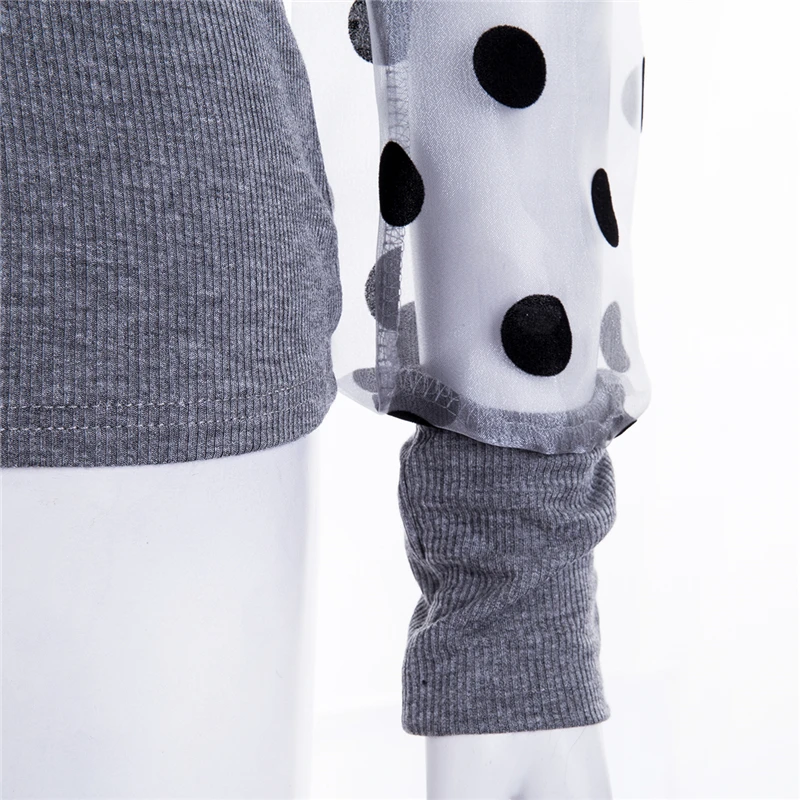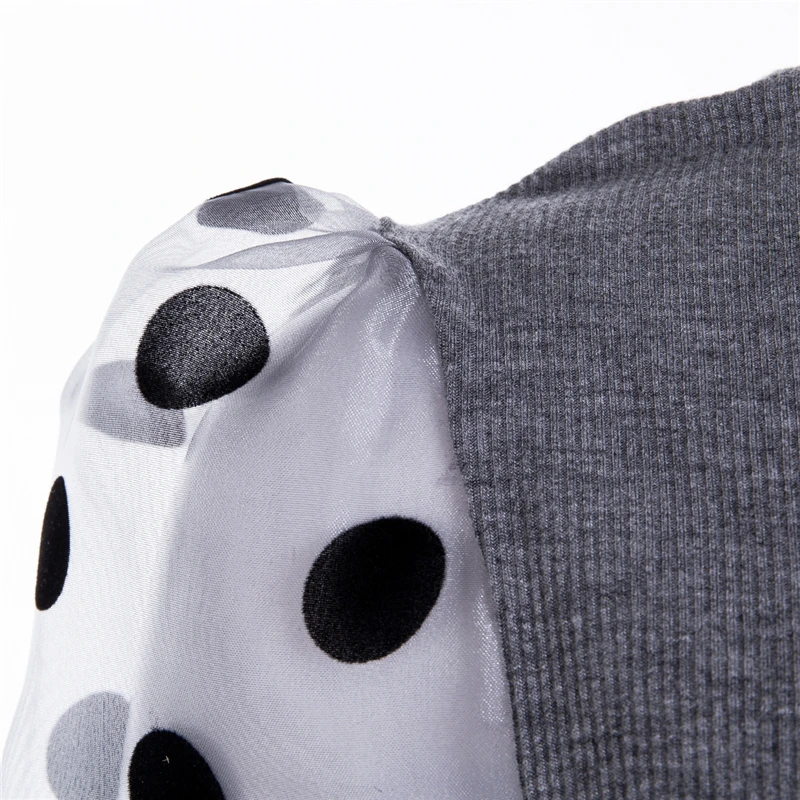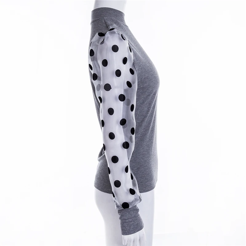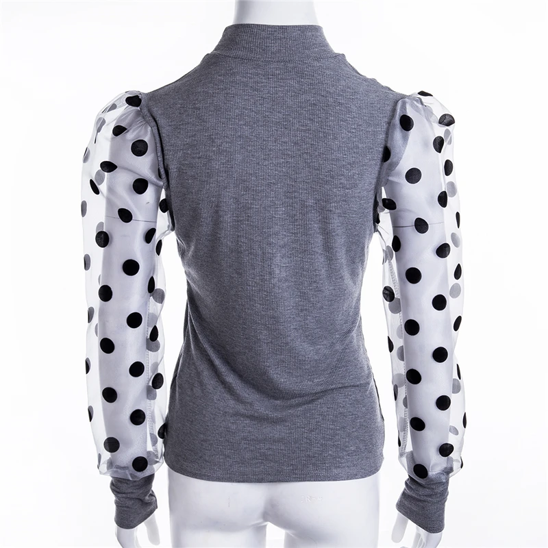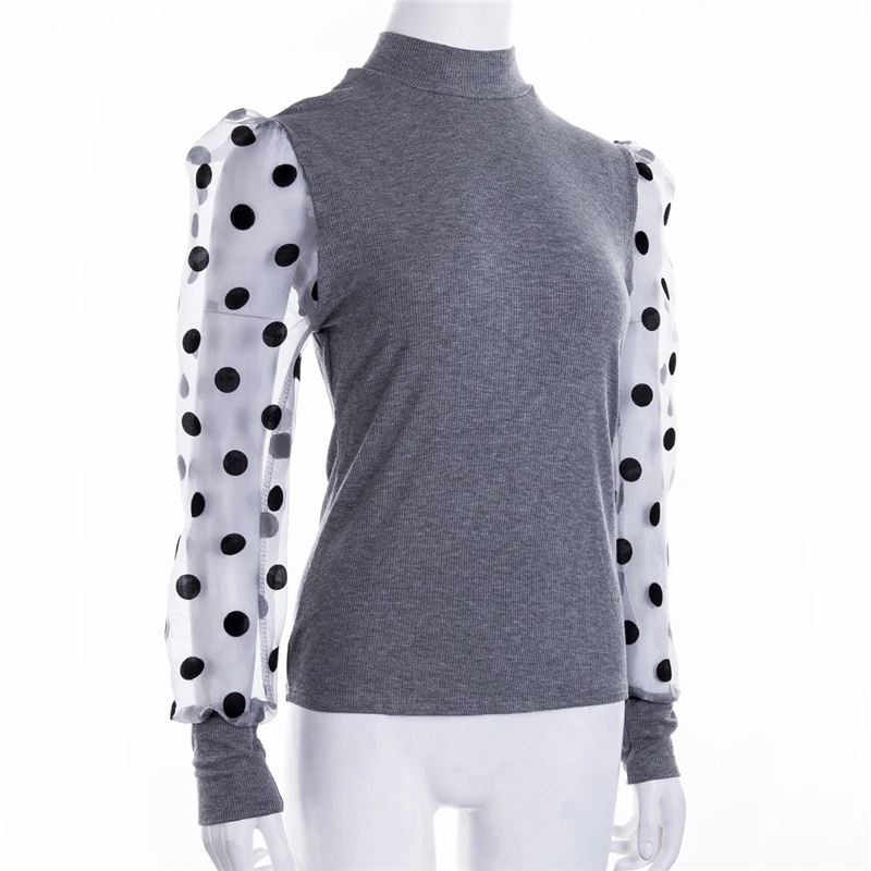 Весенняя женская трикотажная рубашка в рубчик с пышными длинными рукавами, Свободная Повседневная Блузка в горошек, топы, Элегантная водолазка, Клубная одежда Вечерние
