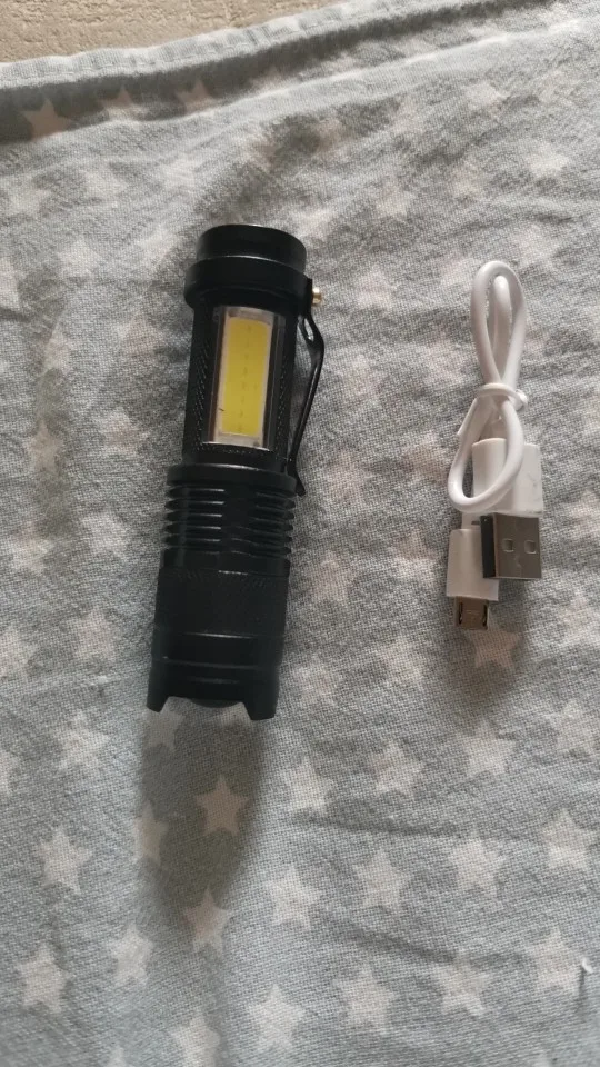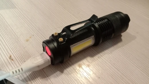 Фонарик отлично светит! В комплекте шёл кабель зарядки. Есть 3 режима работы: Свет, стробоскоп и переноска, что очень удобно. Также у двух первых режимов есть возможность фокусировки пучка света. Фонарик маленький и очень удобный. На сколько хватает аккумулятора не проверял.