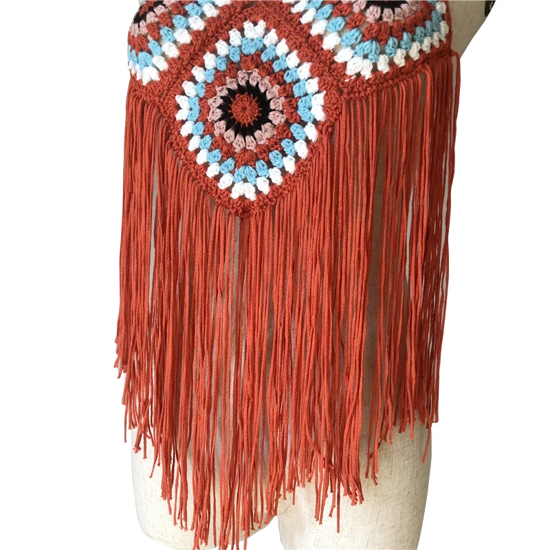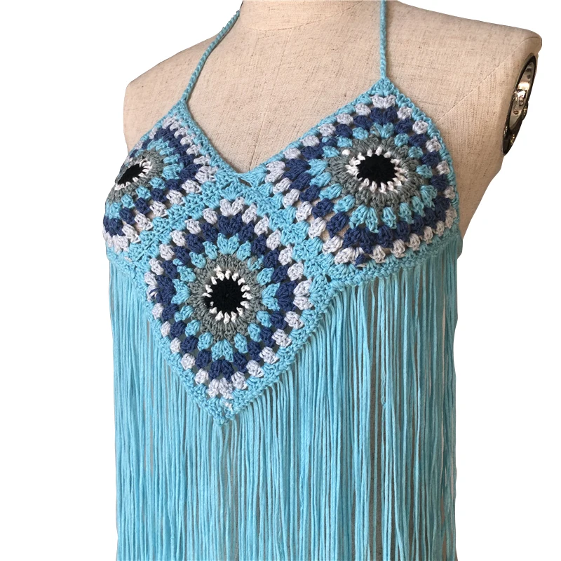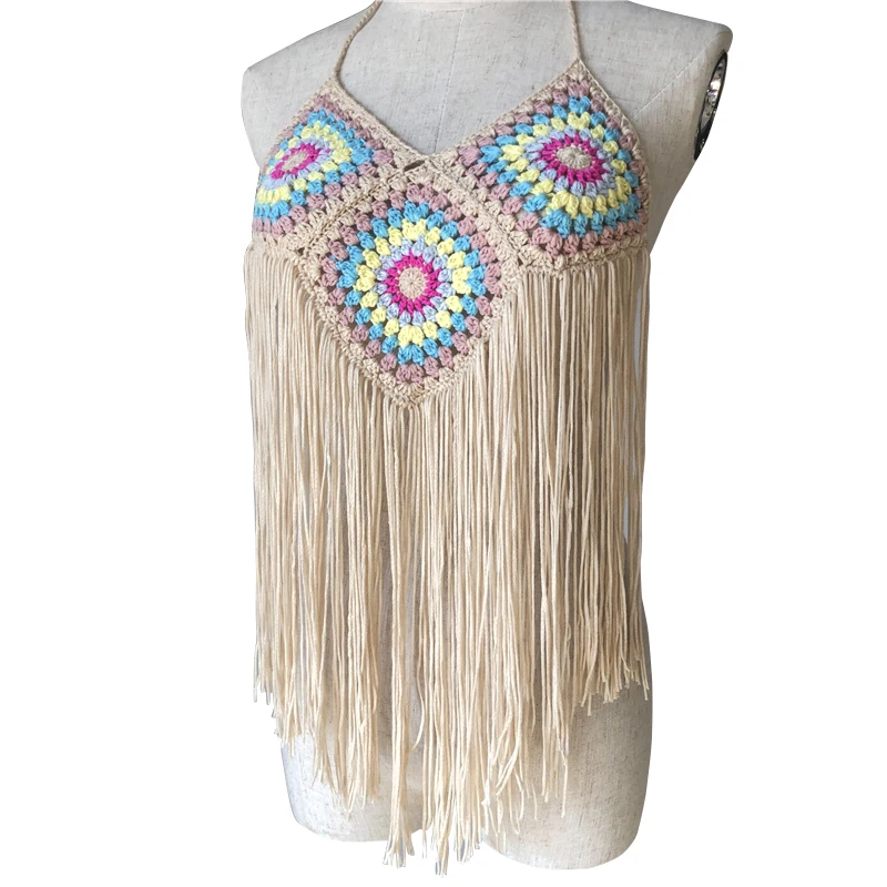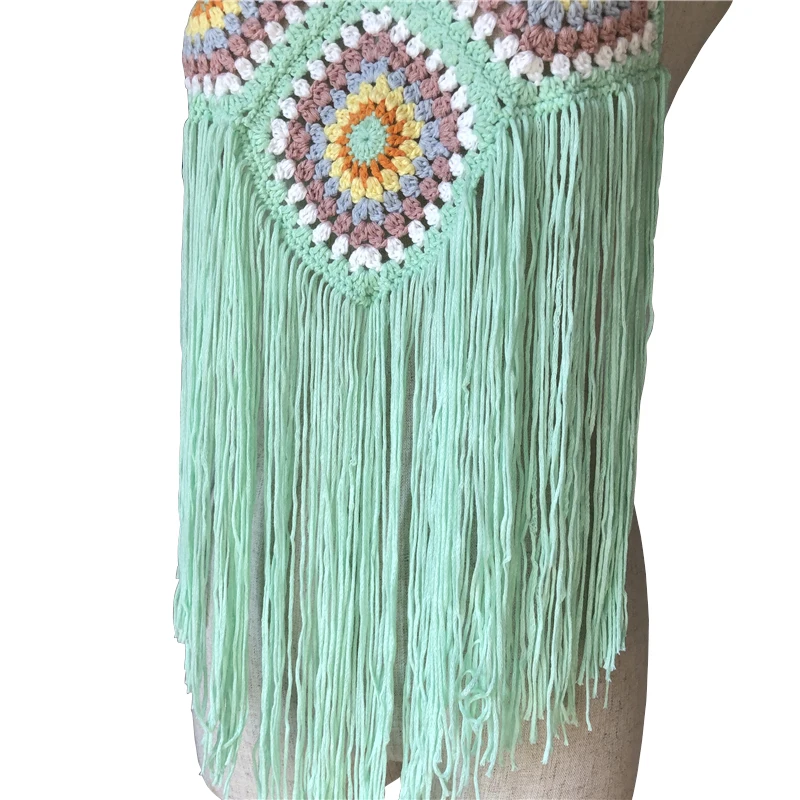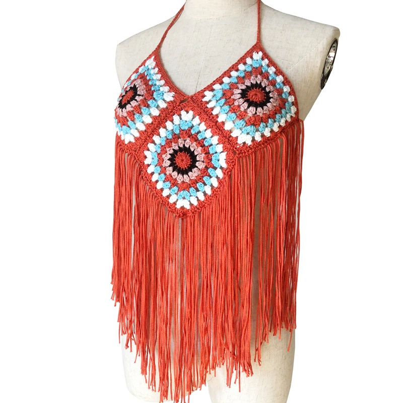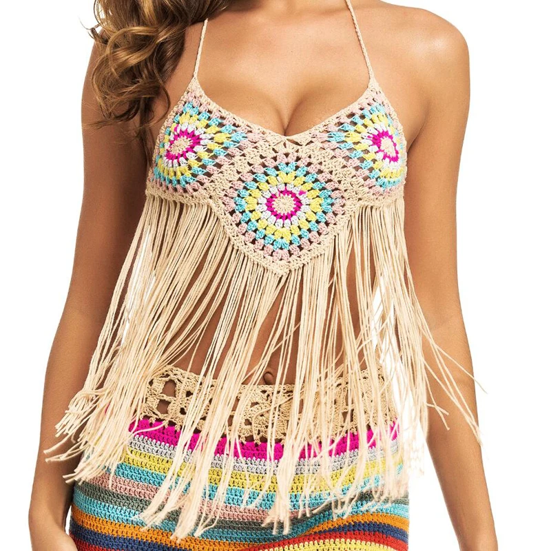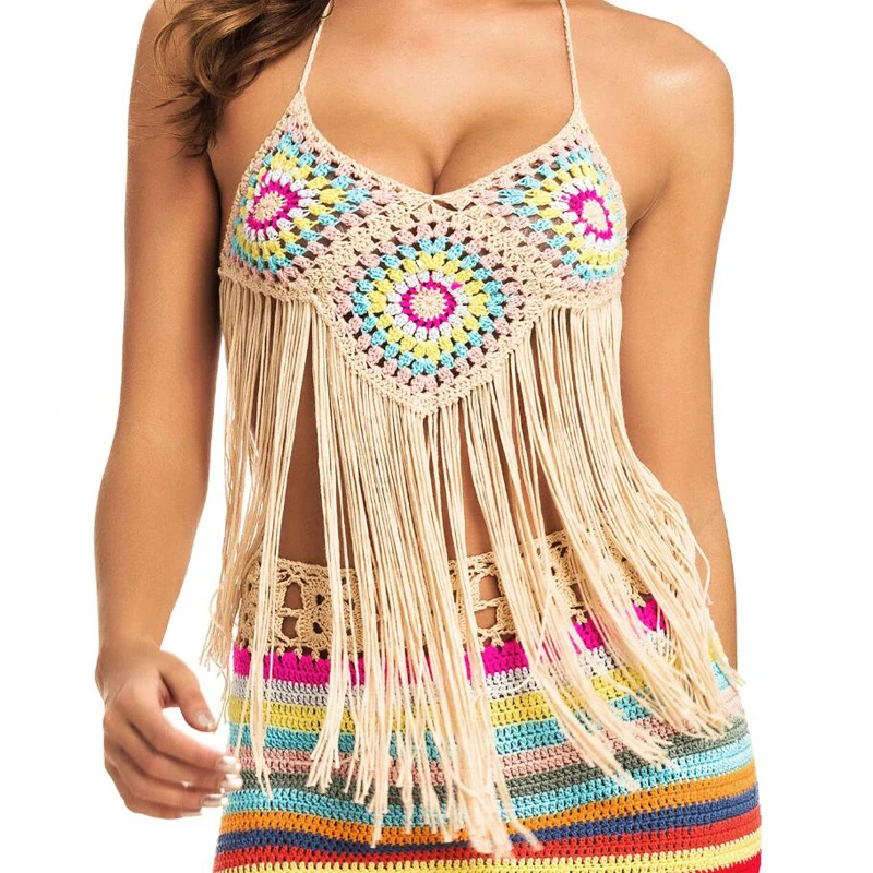 Женское вязаное крючком бикини с кисточками, облегающее бикини, топ, купальник, топы, богемный купальник, сексуальное вязаное крючком бикини ручной работы, хлопковый топ
