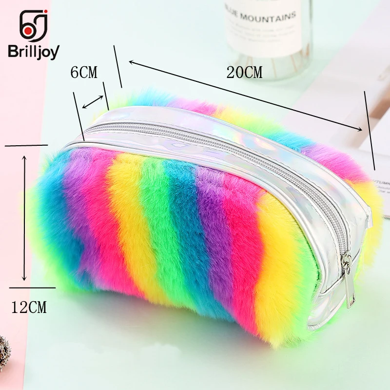 Brilljoy, новинка, радужный мех, цветная косметичка для хранения косметики, кошелек для монет, чехол-карандаш для женщин, школьные принадлежности, ручка, мешочек, канцелярский подарок Материал: пэт + полиэстер Размер продукта: 20*6*12 см (данный размер относится к чистый мерки снимаются вручную, может быть погрешность в 1 см до 0,5 см) Вес изделия: 70 г Название продукта: плюшевая студенческая карандаш чехол, портмоне, сумка для хранения, косметичка