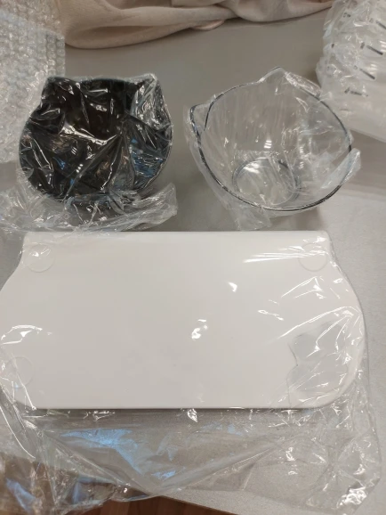 Все пришло в идеальном состоянии, упаковано было очень хорошо. Был запах, но быстро выветрился. Миска устойчивая с надёжным креплением. Форма как раз отлично подходит для кошек, очень удобная.