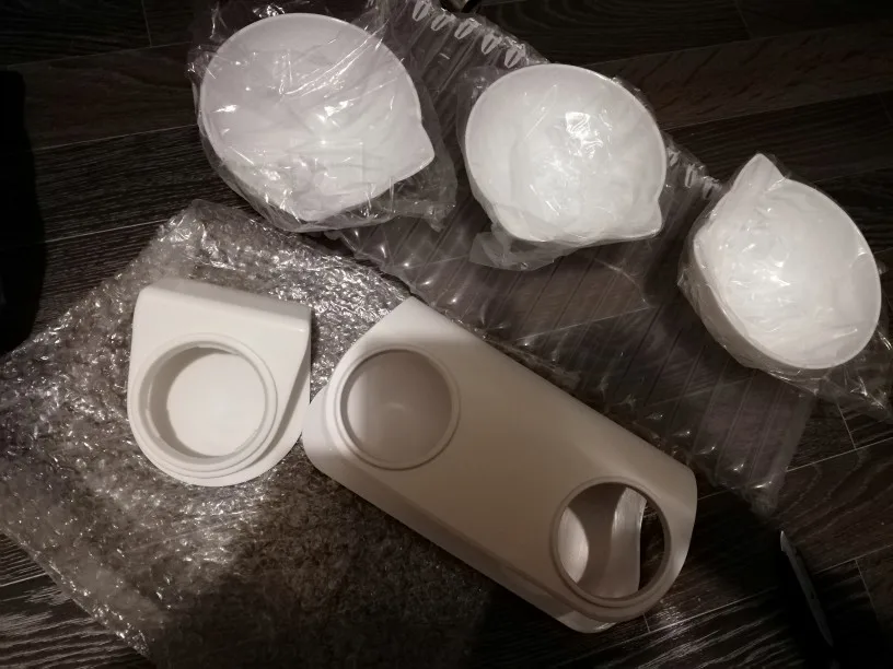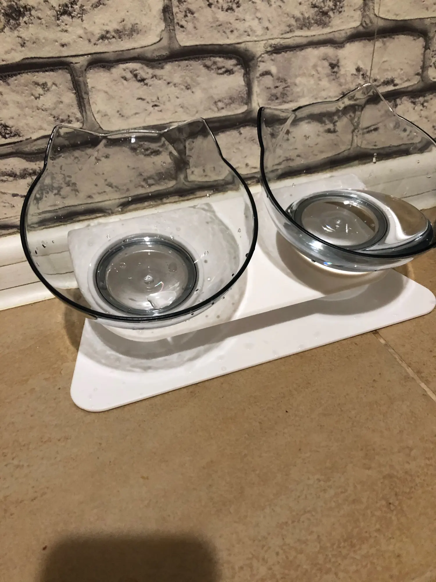 Миски очень классные, но воды много не налить тк подставка наклонная, можно что то внутрь наверное засунуть чтоб по выше мисочки были. Материал пластик